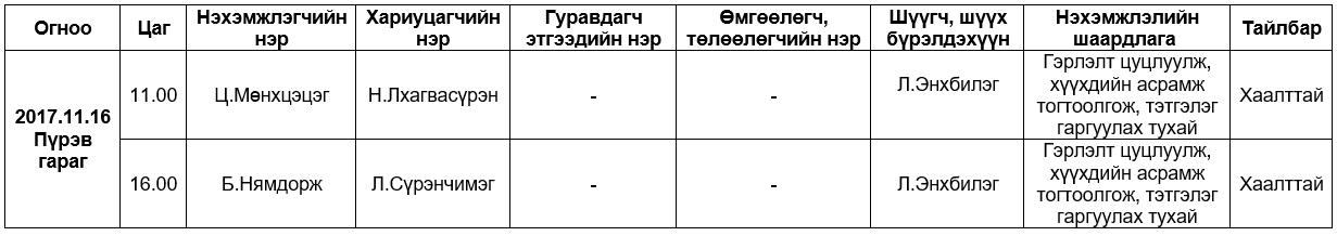 Шүүх хуралдаанаар хэлэлцэх иргэний хэргүүд (2017.11.13-11.17)