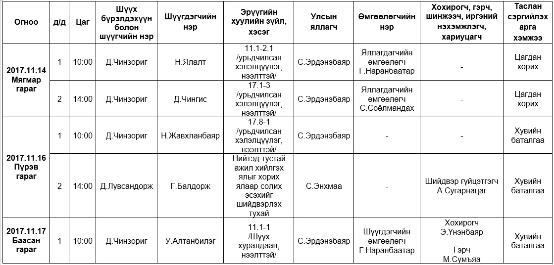 АНХАН ШАТНЫ ШҮҮХ ХУРАЛДААНААР ХЭЛЭЛЦҮҮЛЭХ ЭРҮҮГИЙН ХЭРГҮҮД (2017.11.13-11.17)