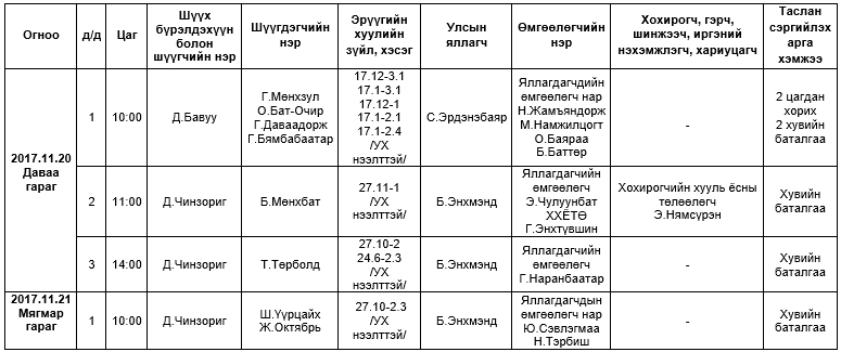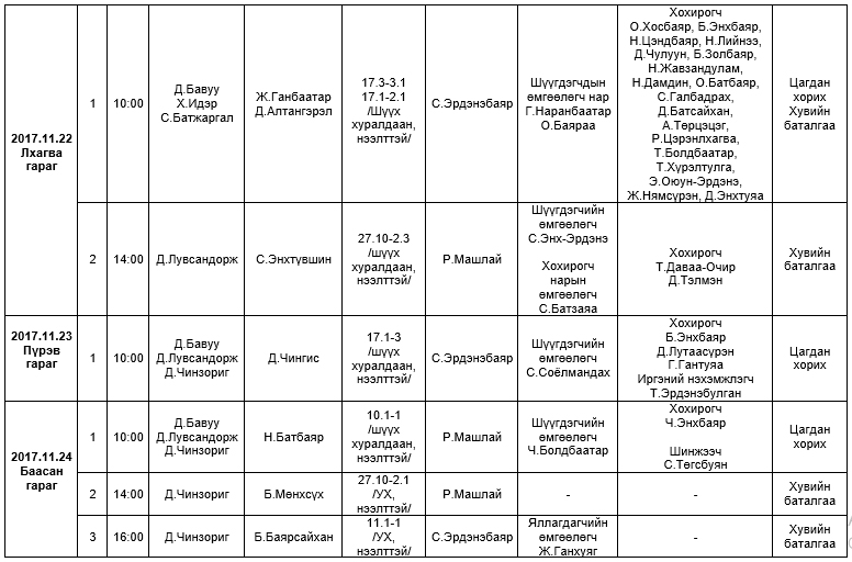 АНХАН ШАТНЫ ШҮҮХ ХУРАЛДААНААР ХЭЛЭЛЦҮҮЛЭХ ЭРҮҮГИЙН ХЭРГҮҮД (2017.11.20-11.24)