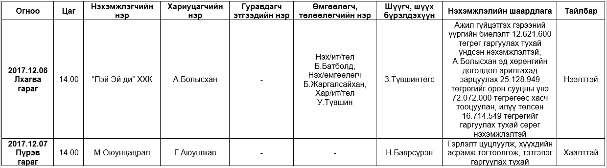 Шүүх хуралдаанаар хэлэлцэх иргэний хэргүүд (2017.12.04-12.08)