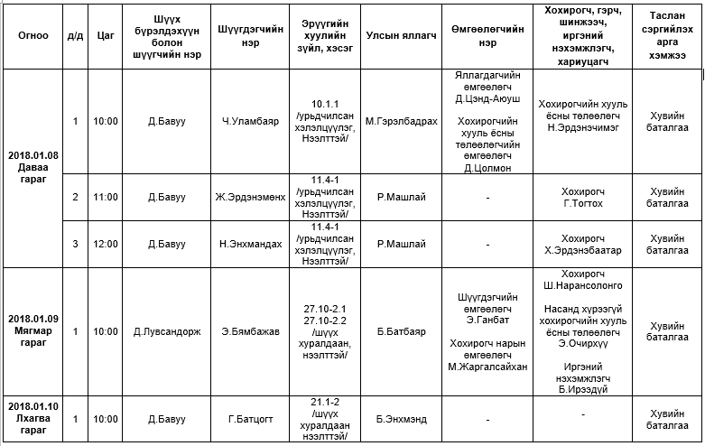 АНХАН ШАТНЫ ШҮҮХ ХУРАЛДААНААР ХЭЛЭЛЦҮҮЛЭХ ЭРҮҮГИЙН ХЭРГҮҮД (2018.01.08-01.12)