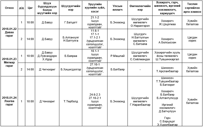 АНХАН ШАТНЫ ШҮҮХ ХУРАЛДААНААР ХЭЛЭЛЦҮҮЛЭХ ЭРҮҮГИЙН ХЭРГҮҮД (2018.01.22-01.26)