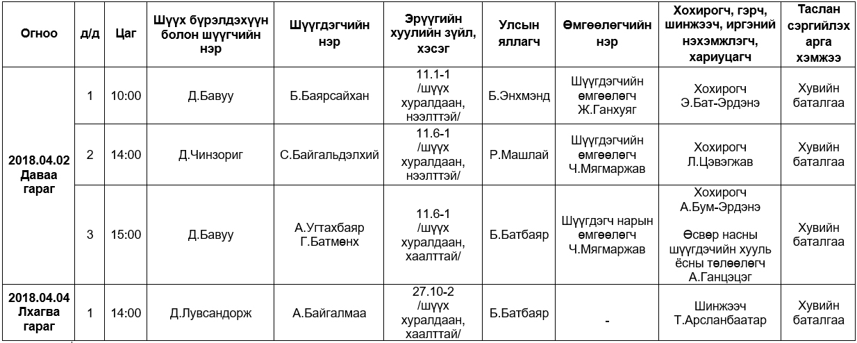 АНХАН ШАТНЫ ШҮҮХ ХУРАЛДААНААР ХЭЛЭЛЦҮҮЛЭХ ЭРҮҮГИЙН ХЭРГҮҮД (2018.04.02-04.06)