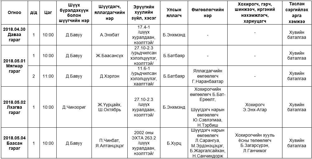 АНХАН ШАТНЫ ШҮҮХ ХУРАЛДААНААР ХЭЛЭЛЦҮҮЛЭХ ЭРҮҮГИЙН ХЭРГҮҮД (2018.04.30-05.04)