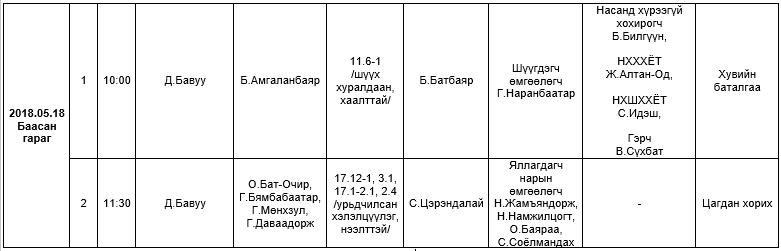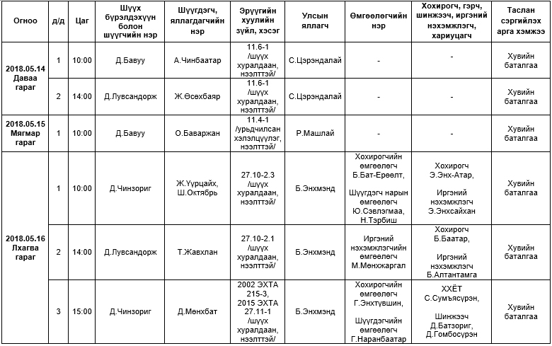 АНХАН ШАТНЫ ШҮҮХ ХУРАЛДААНААР ХЭЛЭЛЦҮҮЛЭХ ЭРҮҮГИЙН ХЭРГҮҮД (2018.05.14-05.18)