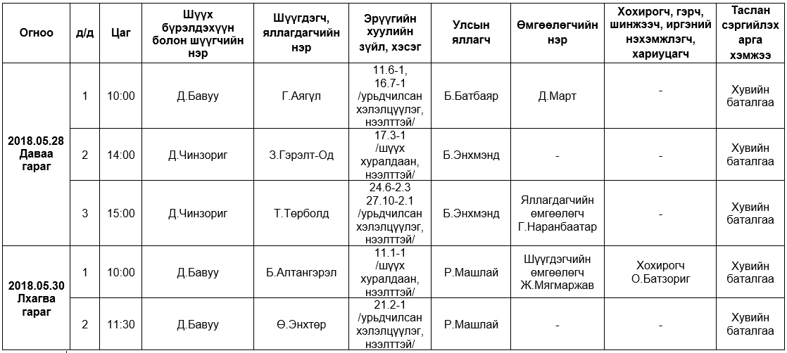 АНХАН ШАТНЫ ШҮҮХ ХУРАЛДААНААР ХЭЛЭЛЦҮҮЛЭХ ЭРҮҮГИЙН ХЭРГҮҮД (2018.05.28-06.01)