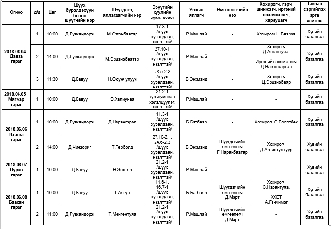 АНХАН ШАТНЫ ШҮҮХ ХУРАЛДААНААР ХЭЛЭЛЦҮҮЛЭХ ЭРҮҮГИЙН ХЭРГҮҮД (2018.06.04-06.08)