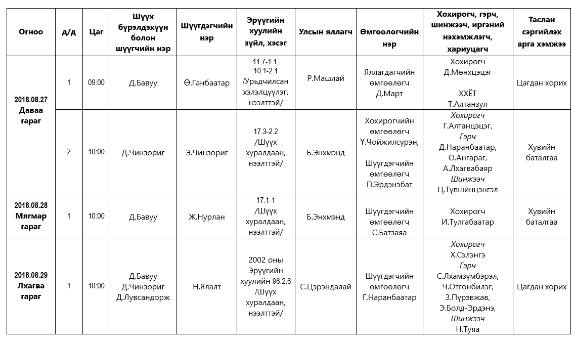 НАЛАЙХ - АНХАН ШАТНЫ ШҮҮХ ХУРАЛДААНААР ХЭЛЭЛЦҮҮЛЭХ ЭРҮҮГИЙН ХЭРГҮҮД (2018.08.27-08.31)