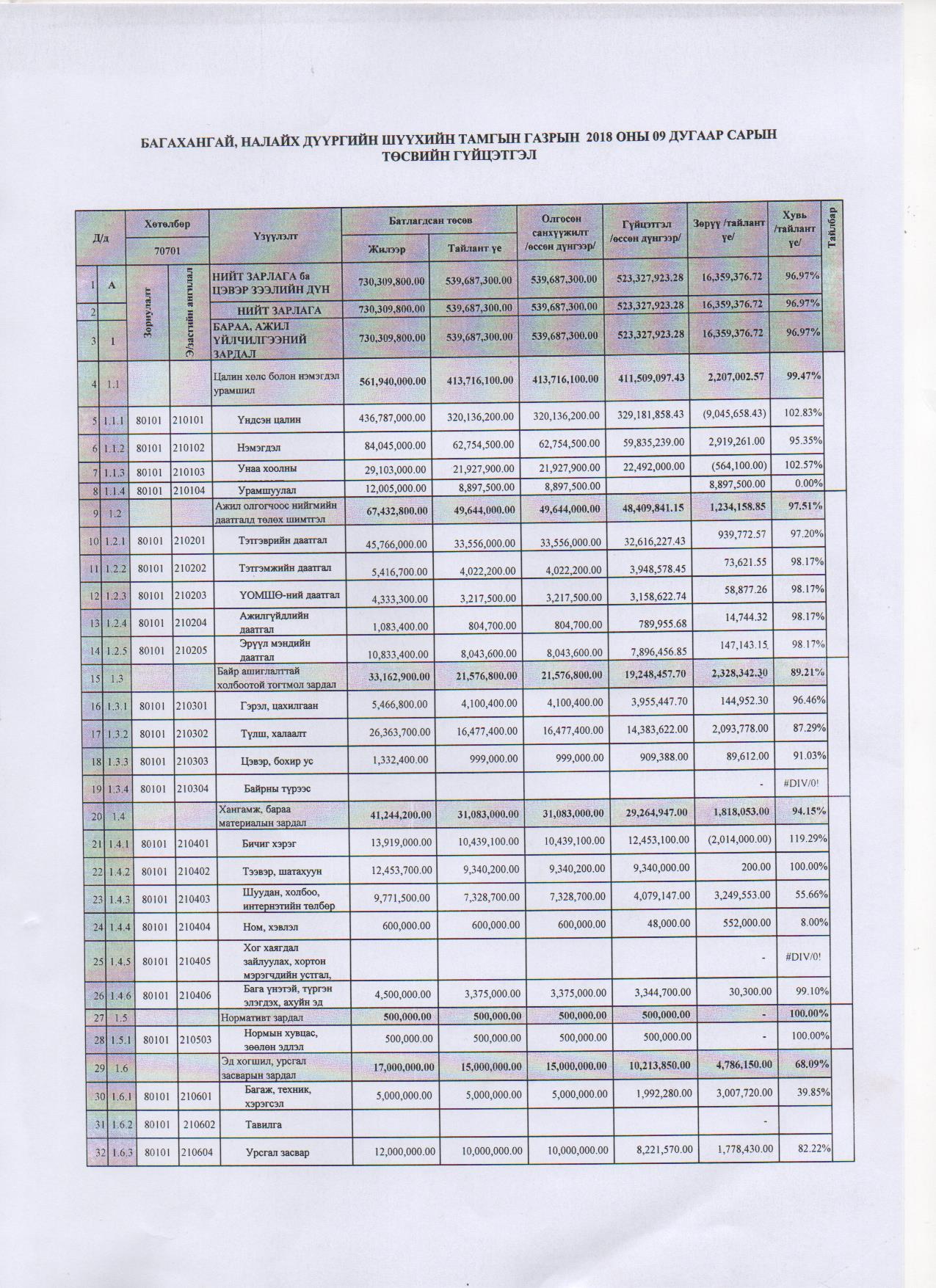 2018 оны 9 дүгээр сарын төсвийн гүйцэтгэл