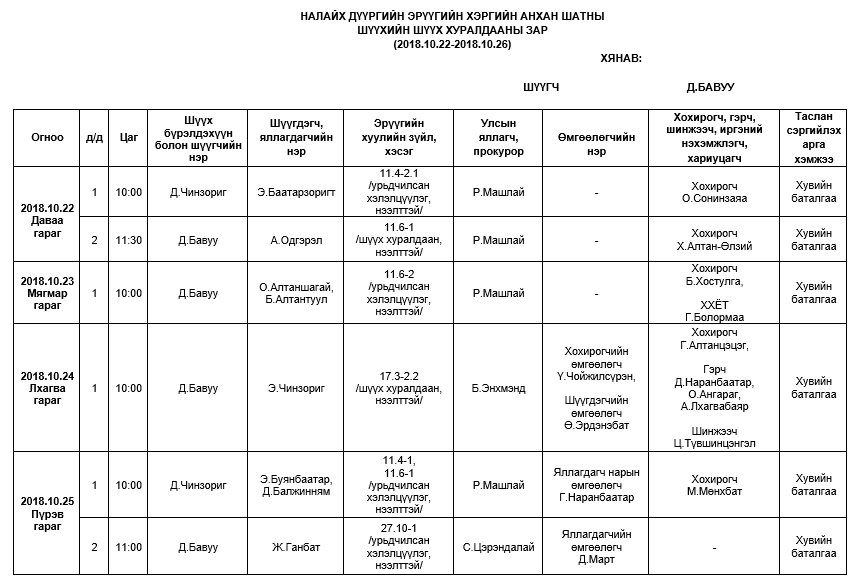 НАЛАЙХ - АНХАН ШАТНЫ ШҮҮХ ХУРАЛДААНААР ХЭЛЭЛЦҮҮЛЭХ ЭРҮҮГИЙН ХЭРГҮҮД (2018.10.22-10.26)