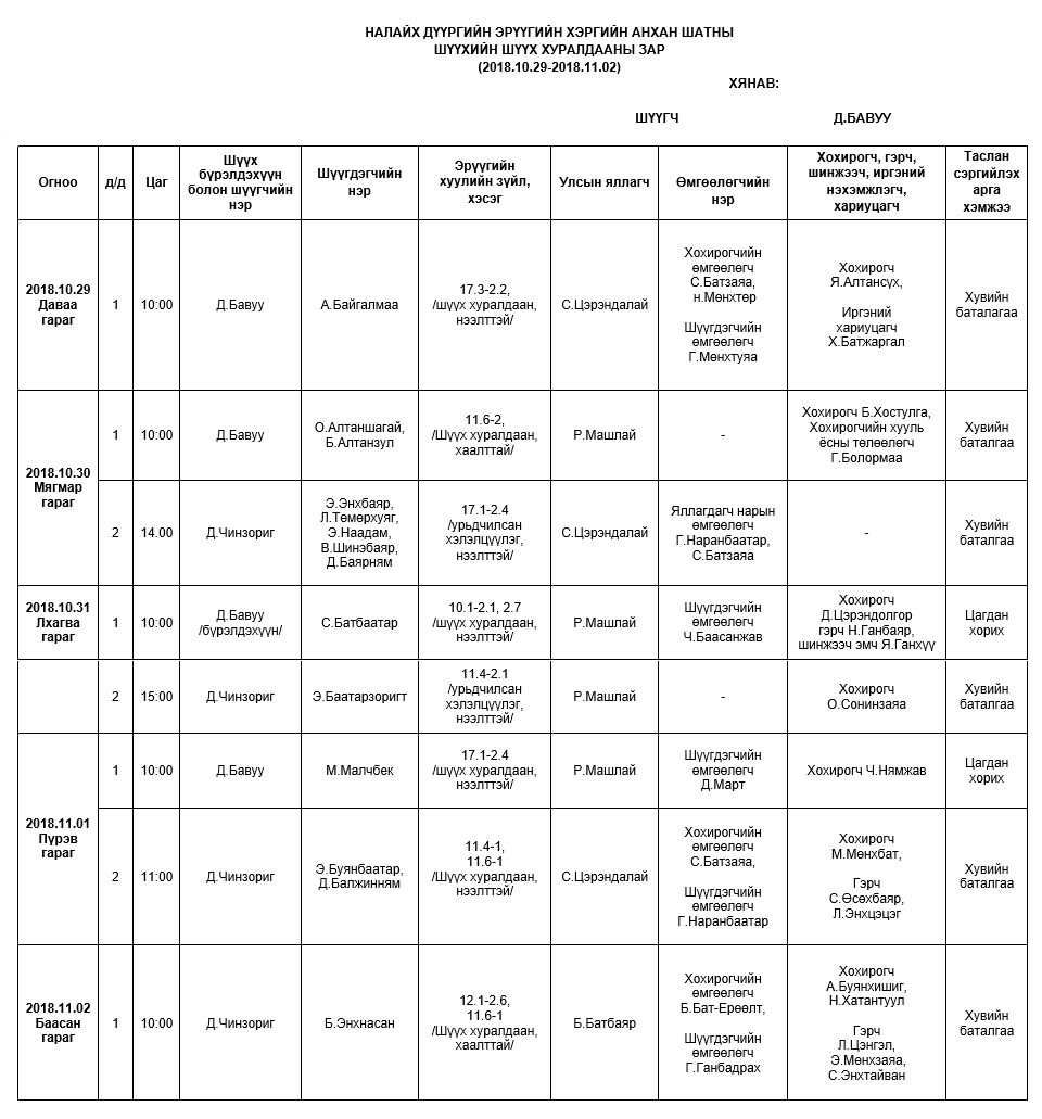 НАЛАЙХ - АНХАН ШАТНЫ ШҮҮХ ХУРАЛДААНААР ХЭЛЭЛЦҮҮЛЭХ ЭРҮҮГИЙН ХЭРГҮҮД (2018.10.29-11.02)