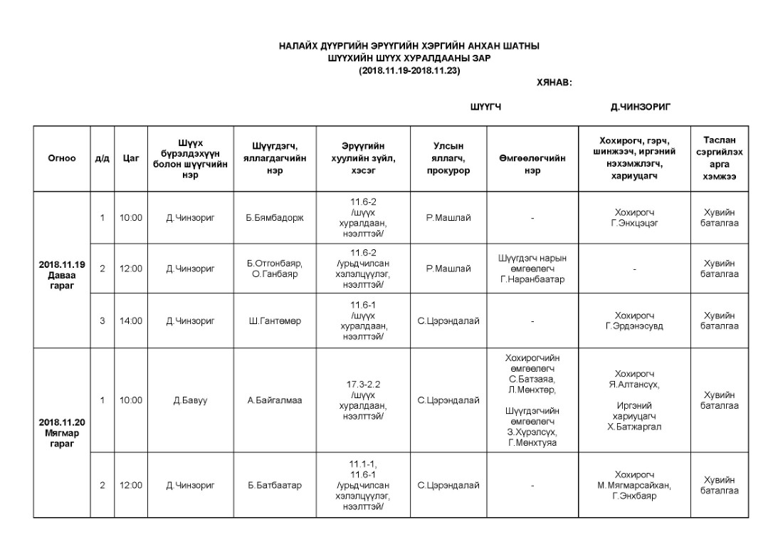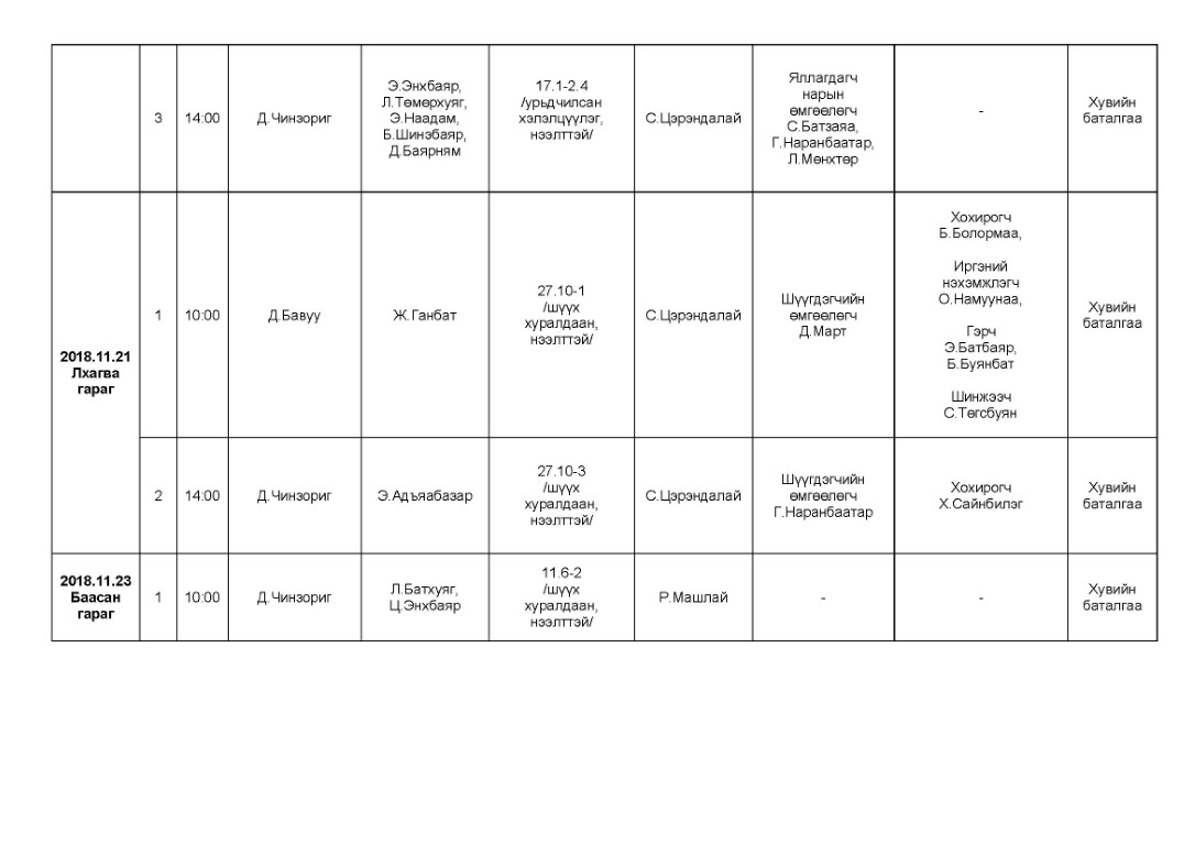 НАЛАЙХ - АНХАН ШАТНЫ ШҮҮХ ХУРАЛДААНААР ХЭЛЭЛЦҮҮЛЭХ ЭРҮҮГИЙН ХЭРГҮҮД (2018.11.19-11.23)