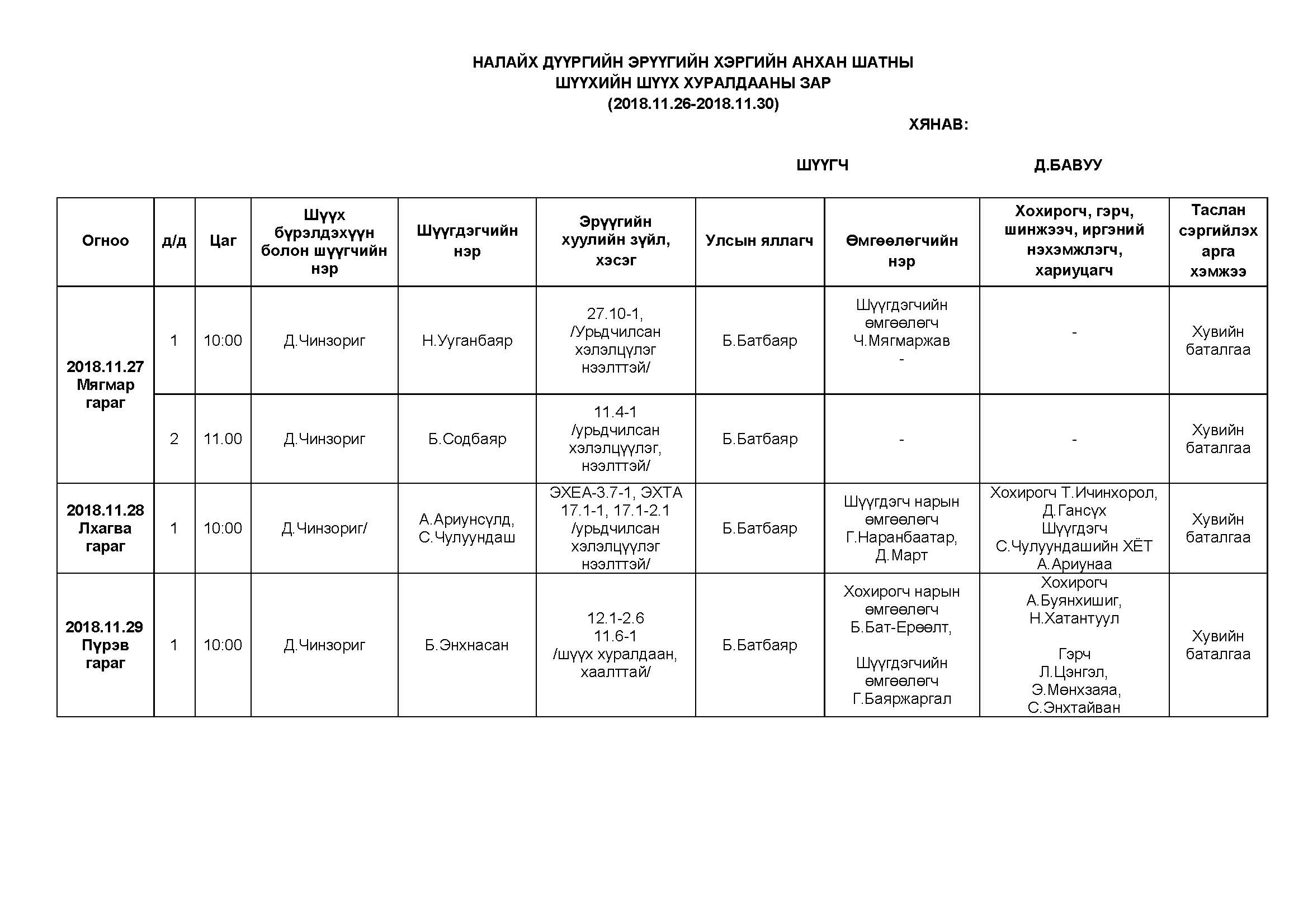 НАЛАЙХ - АНХАН ШАТНЫ ШҮҮХ ХУРАЛДААНААР ХЭЛЭЛЦҮҮЛЭХ ЭРҮҮГИЙН ХЭРГҮҮД (2018.11.26-11.30)