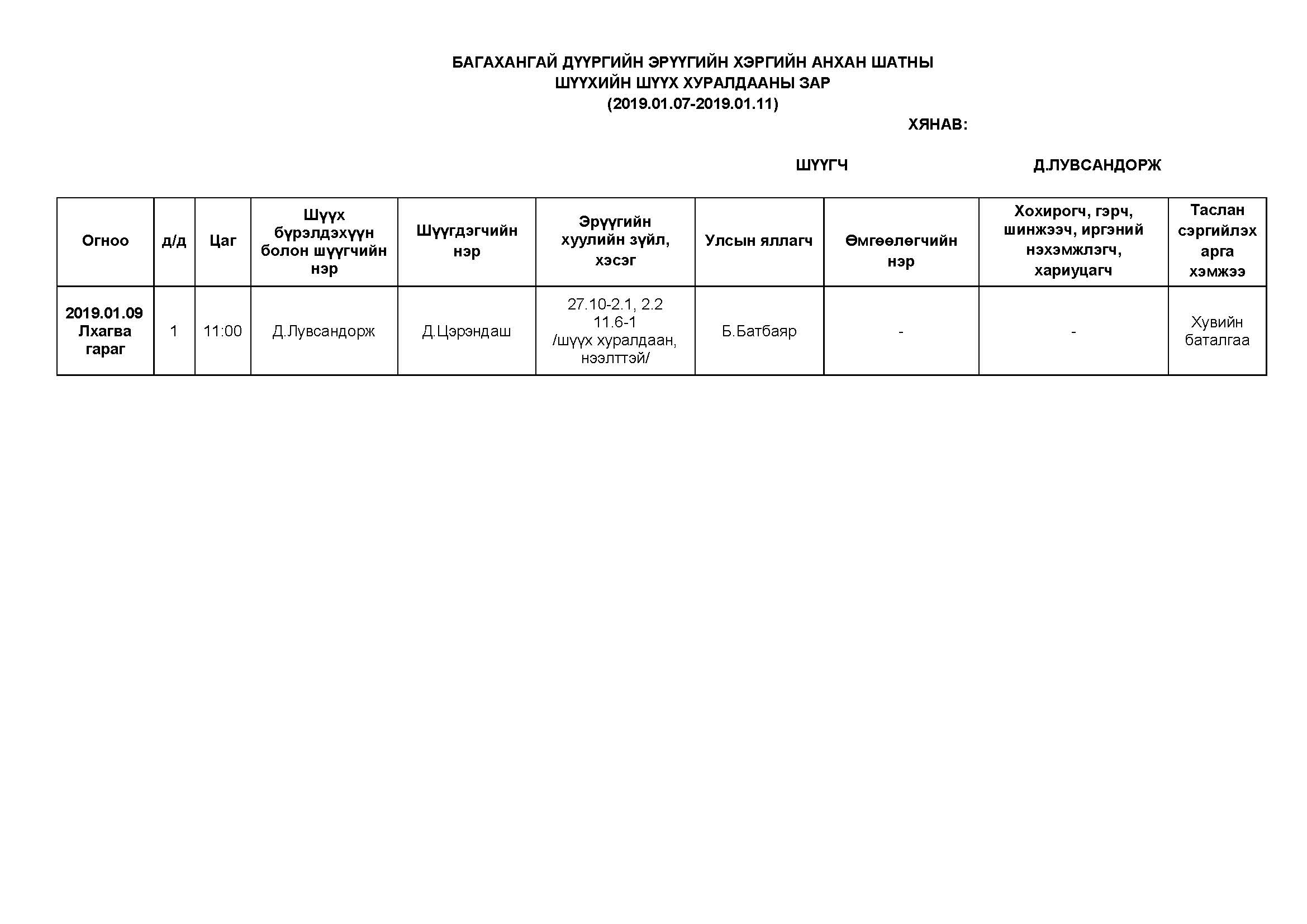 БАГАХАНГАЙ - АНХАН ШАТНЫ ШҮҮХ ХУРАЛДААНААР ХЭЛЭЛЦҮҮЛЭХ ЭРҮҮГИЙН ХЭРГҮҮД (2019.01.07-01.11)