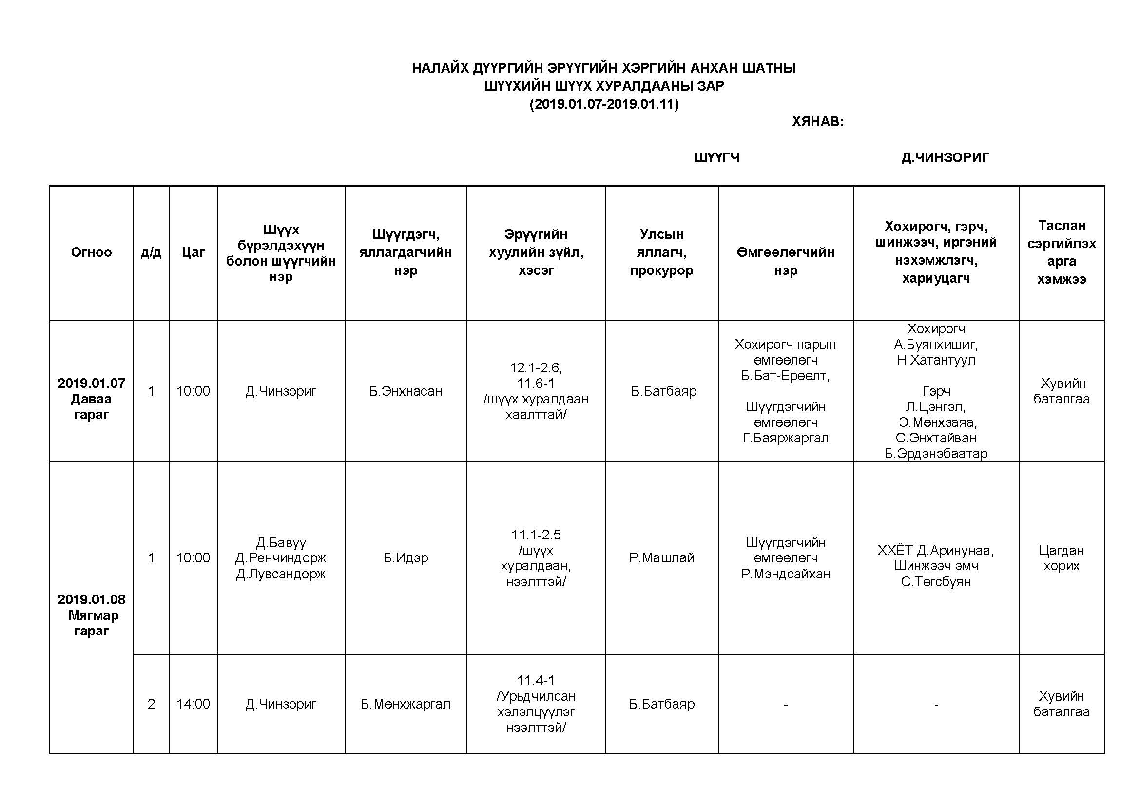 НАЛАЙХ - АНХАН ШАТНЫ ШҮҮХ ХУРАЛДААНААР ХЭЛЭЛЦҮҮЛЭХ ЭРҮҮГИЙН ХЭРГҮҮД (2019.01.07-01.11)