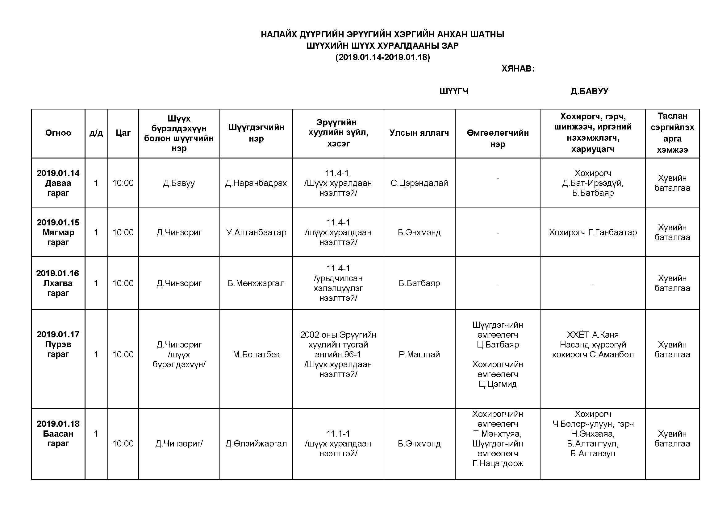 НАЛАЙХ - АНХАН ШАТНЫ ШҮҮХ ХУРАЛДААНААР ХЭЛЭЛЦҮҮЛЭХ ЭРҮҮГИЙН ХЭРГҮҮД (2019.01.14-01.18)