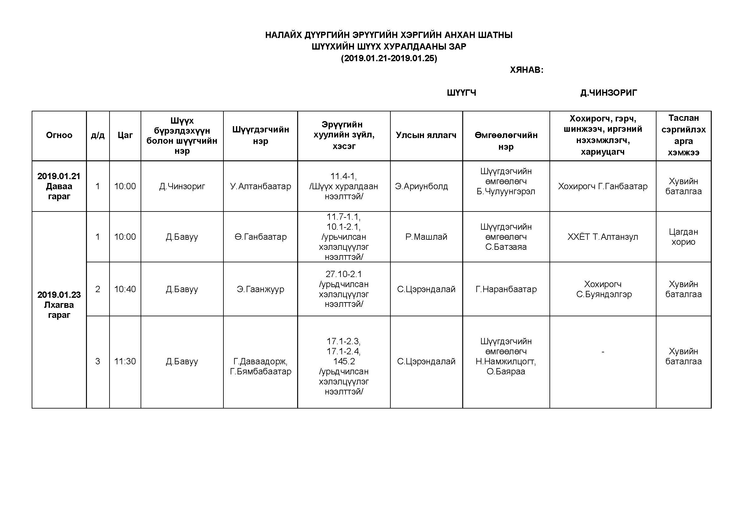 НАЛАЙХ - АНХАН ШАТНЫ ШҮҮХ ХУРАЛДААНААР ХЭЛЭЛЦҮҮЛЭХ ЭРҮҮГИЙН ХЭРГҮҮД (2019.01.21-01.25)