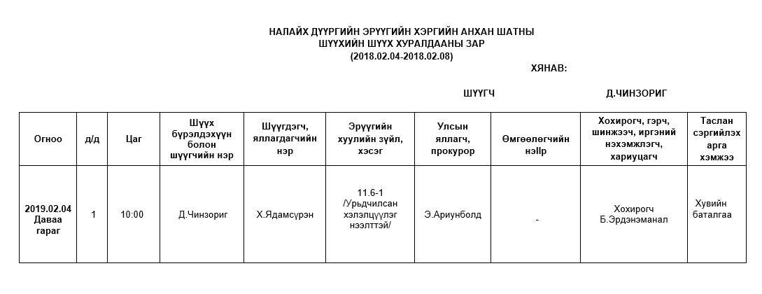 НАЛАЙХ - АНХАН ШАТНЫ ШҮҮХ ХУРАЛДААНААР ХЭЛЭЛЦҮҮЛЭХ ЭРҮҮГИЙН ХЭРГҮҮД (2019.02.04-02.08)