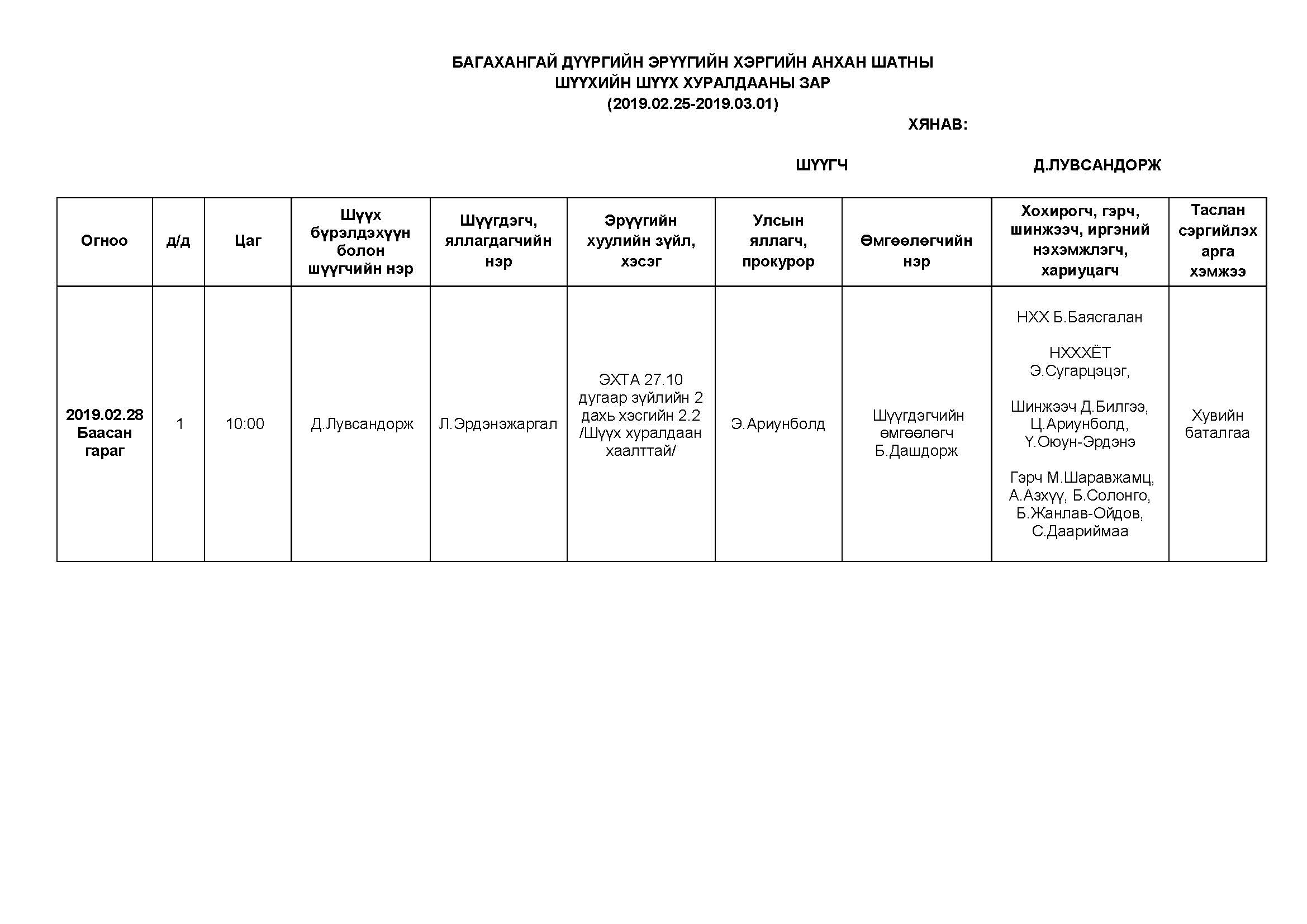 БАГАХАНГАЙ - АНХАН ШАТНЫ ШҮҮХ ХУРАЛДААНААР ХЭЛЭЛЦҮҮЛЭХ ЭРҮҮГИЙН ХЭРГҮҮД (2019.02.25-02.03.01)