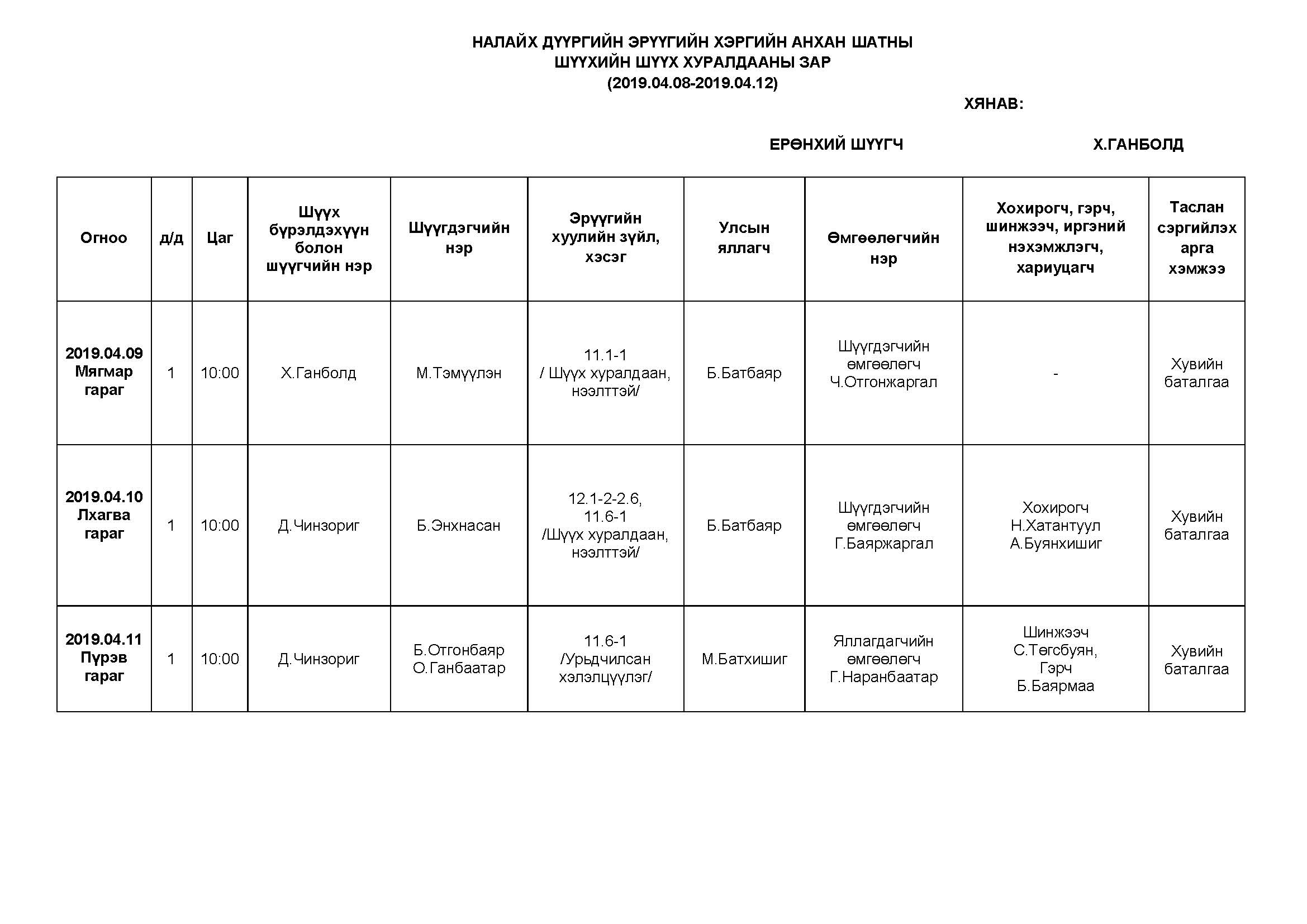 НАЛАЙХ - АНХАН ШАТНЫ ШҮҮХ ХУРАЛДААНААР ХЭЛЭЛЦҮҮЛЭХ ЭРҮҮГИЙН ХЭРГҮҮД (2019.04.08-04.12)