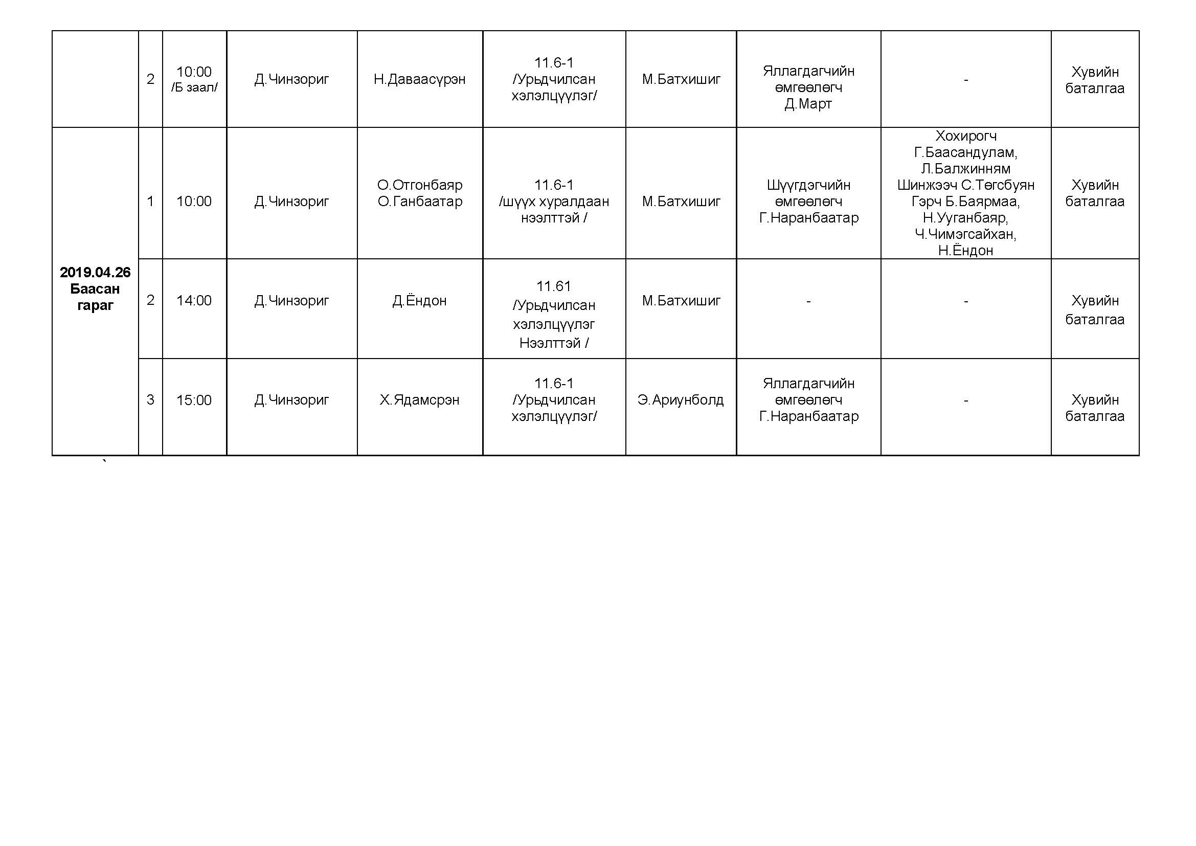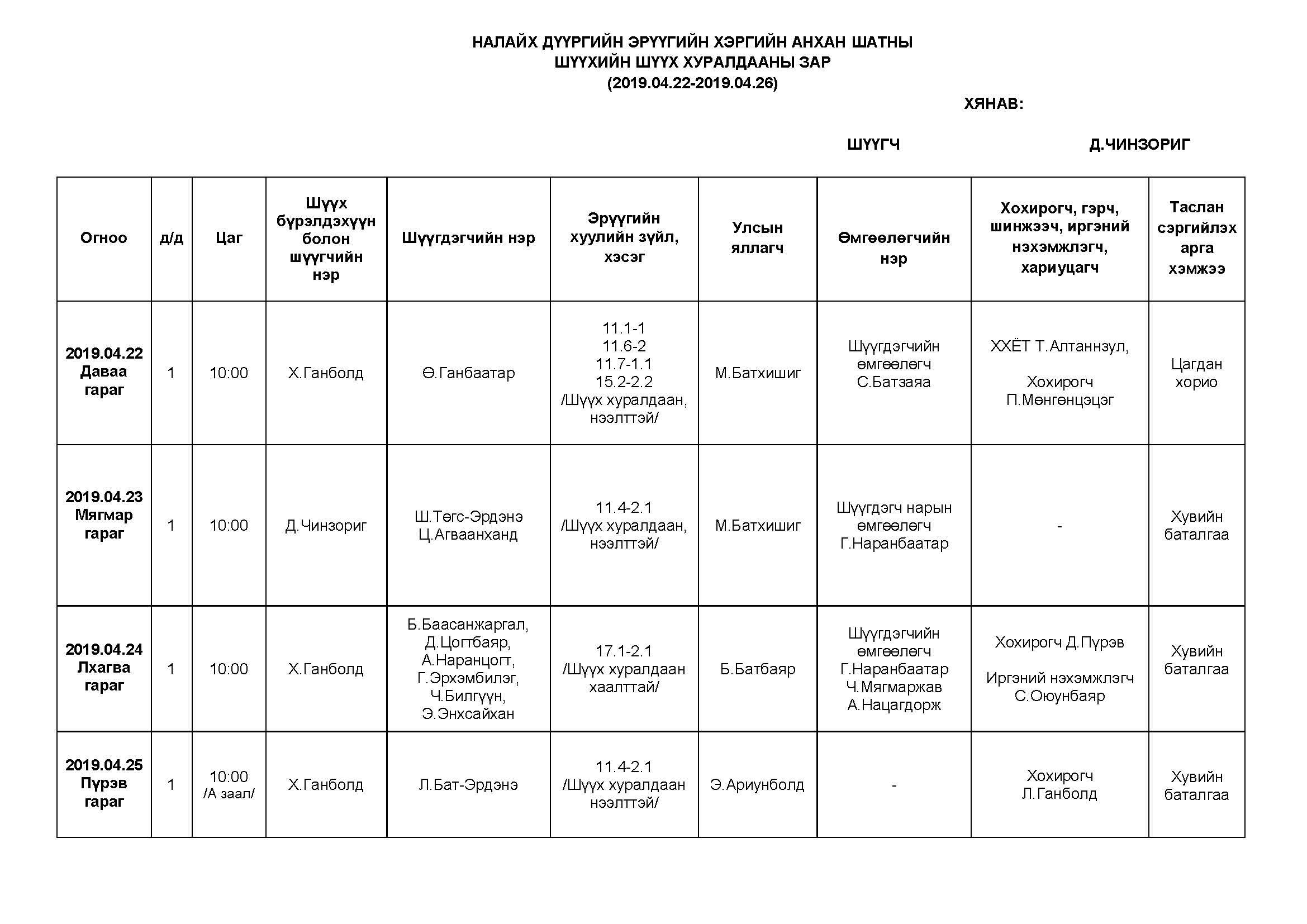 НАЛАЙХ - АНХАН ШАТНЫ ШҮҮХ ХУРАЛДААНААР ХЭЛЭЛЦҮҮЛЭХ ЭРҮҮГИЙН ХЭРГҮҮД (2019.04.22-04.26)
