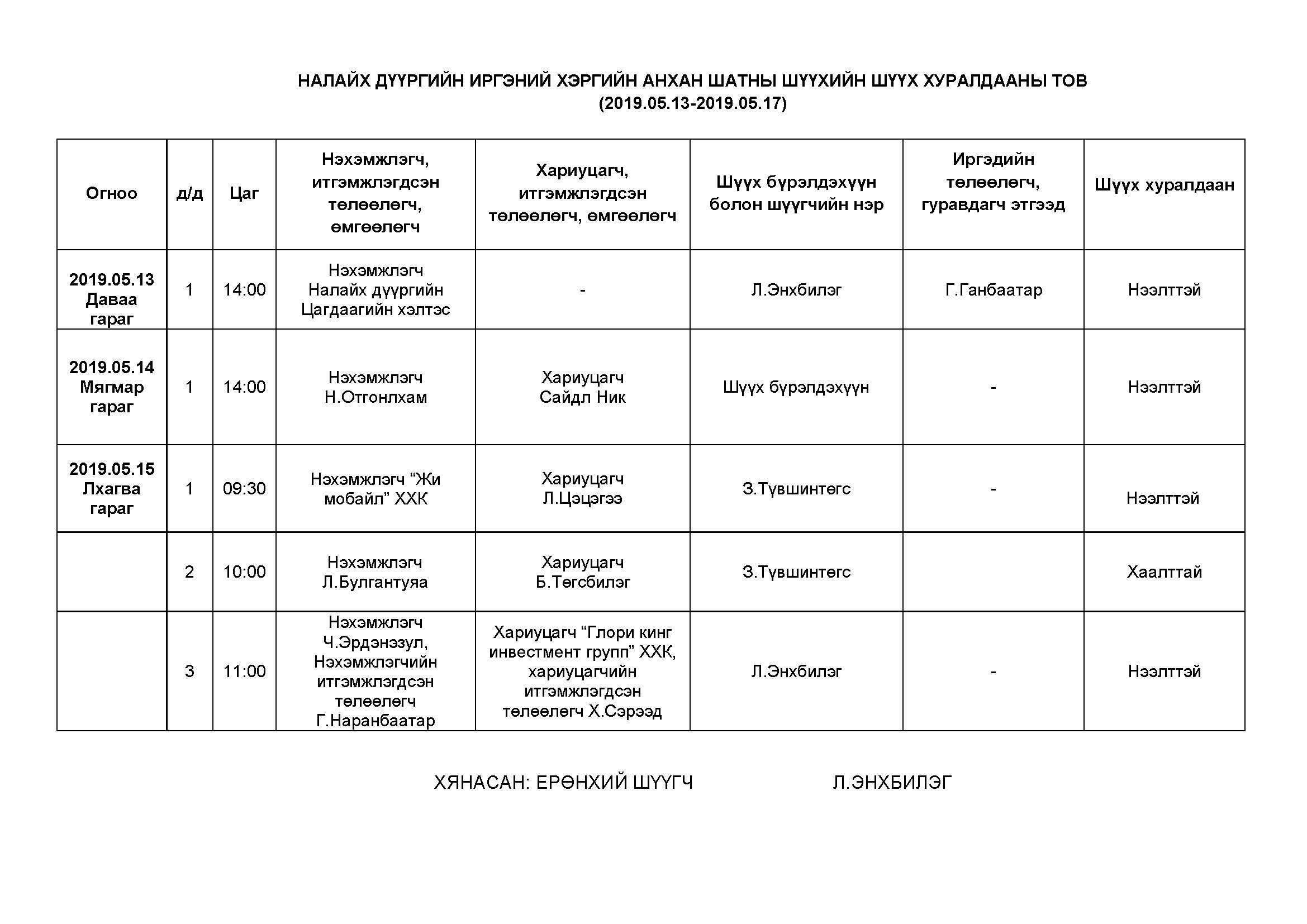 Налайх - Шүүх хуралдаанаар хэлэлцэх иргэний хэргүүд (2019.05.13-05.17)