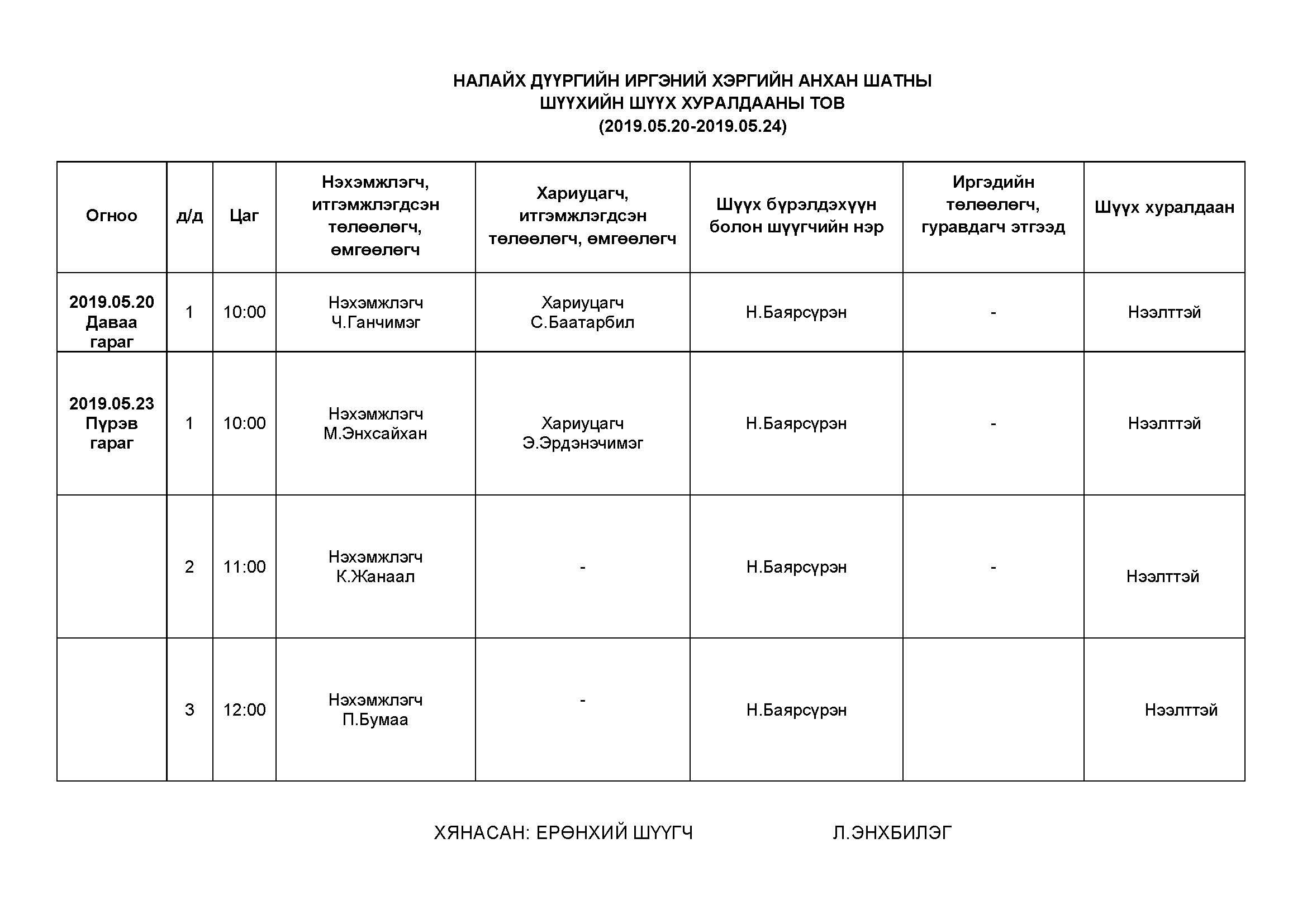 Налайх - Шүүх хуралдаанаар хэлэлцэх иргэний хэргүүд (2019.05.20-05.24)