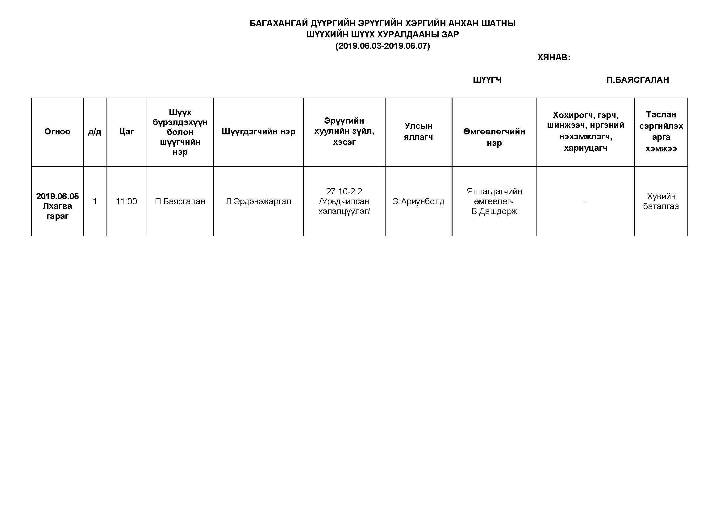 БАГАХАНГАЙ - АНХАН ШАТНЫ ШҮҮХ ХУРАЛДААНААР ХЭЛЭЛЦҮҮЛЭХ ЭРҮҮГИЙН ХЭРГҮҮД (2019.06.03-06.07)