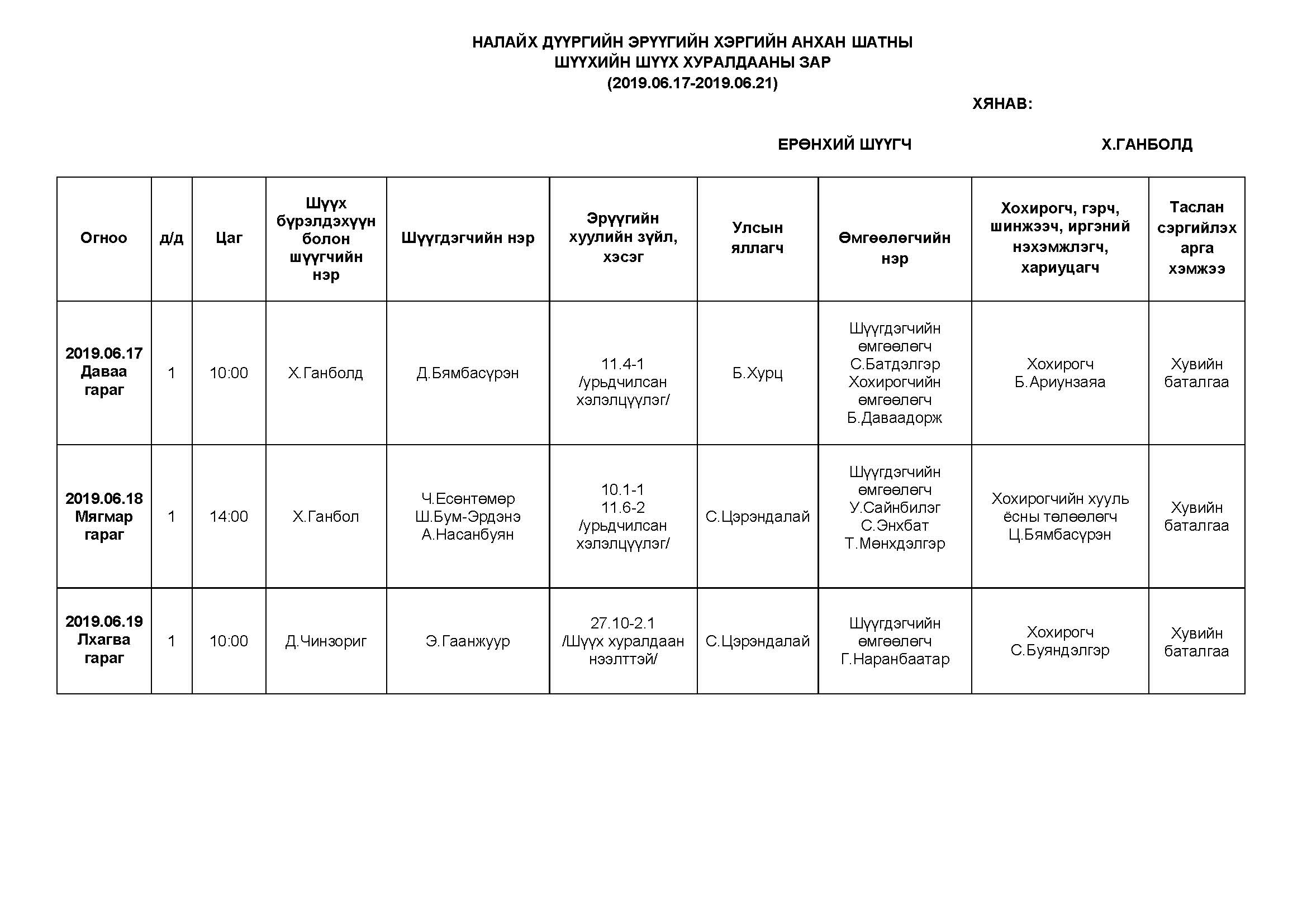 НАЛАЙХ - АНХАН ШАТНЫ ШҮҮХ ХУРАЛДААНААР ХЭЛЭЛЦҮҮЛЭХ ЭРҮҮГИЙН ХЭРГҮҮД (2019.06.17-06.21)
