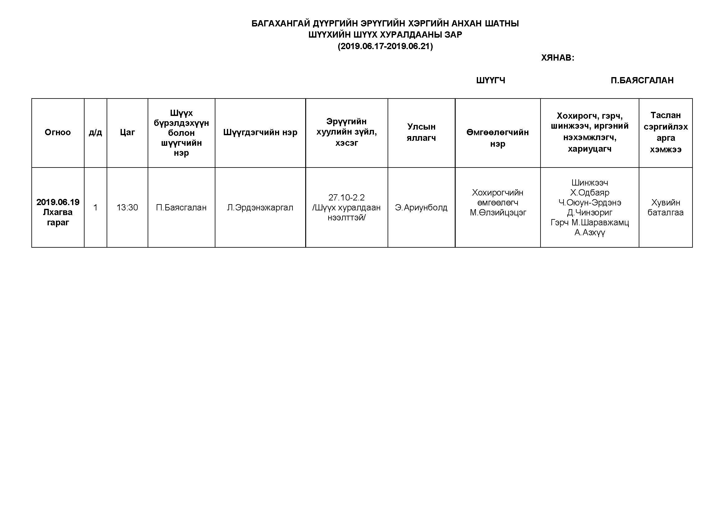 БАГАХАНГАЙ - АНХАН ШАТНЫ ШҮҮХ ХУРАЛДААНААР ХЭЛЭЛЦҮҮЛЭХ ЭРҮҮГИЙН ХЭРГҮҮД (2019.06.17-06.21)