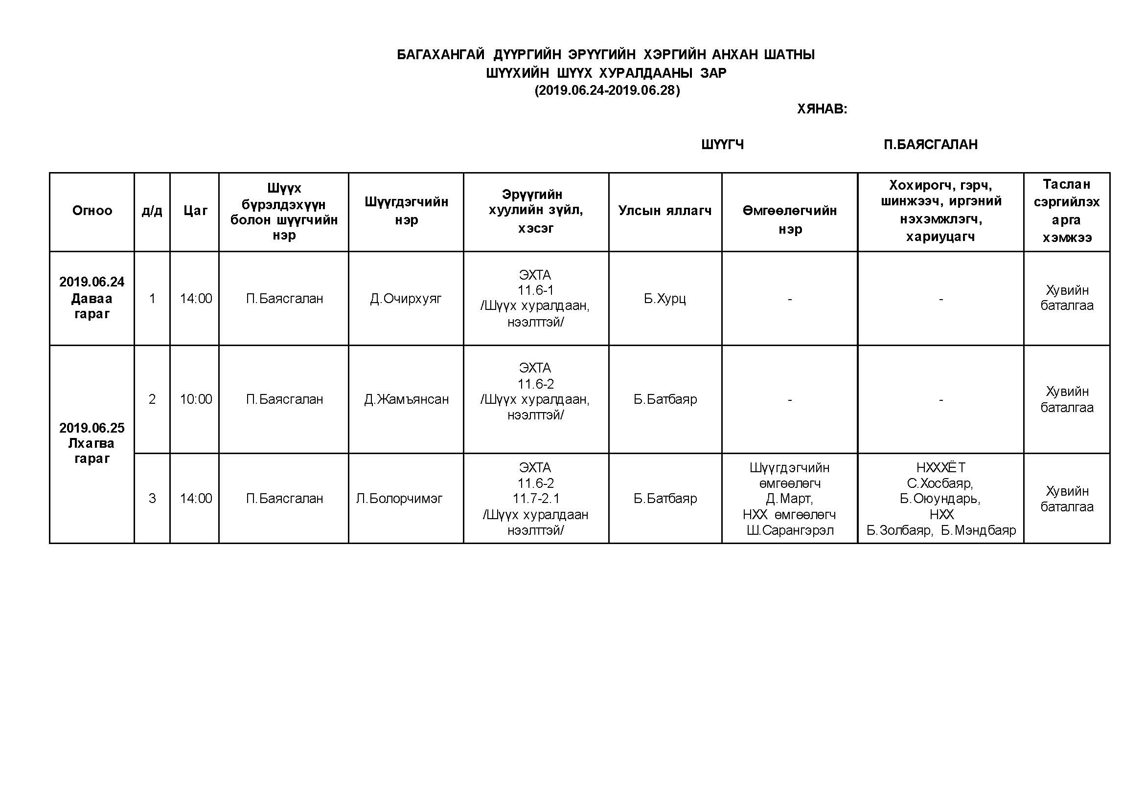 БАГАХАНГАЙ - АНХАН ШАТНЫ ШҮҮХ ХУРАЛДААНААР ХЭЛЭЛЦҮҮЛЭХ ЭРҮҮГИЙН ХЭРГҮҮД (2019.06.24-06.28)