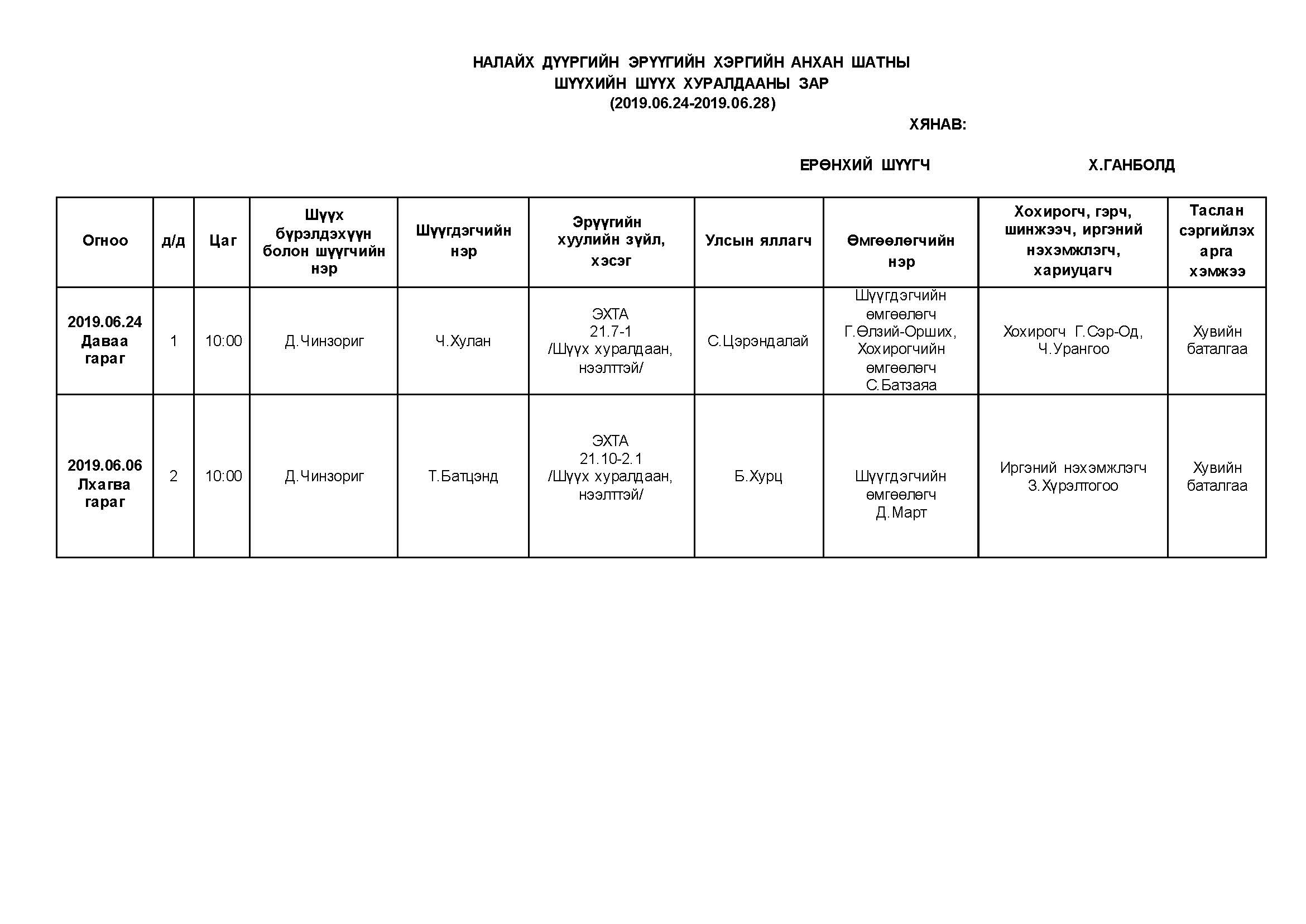 НАЛХАЙХ - АНХАН ШАТНЫ ШҮҮХ ХУРАЛДААНААР ХЭЛЭЛЦҮҮЛЭХ ЭРҮҮГИЙН ХЭРГҮҮД (2019.06.24-06.28)