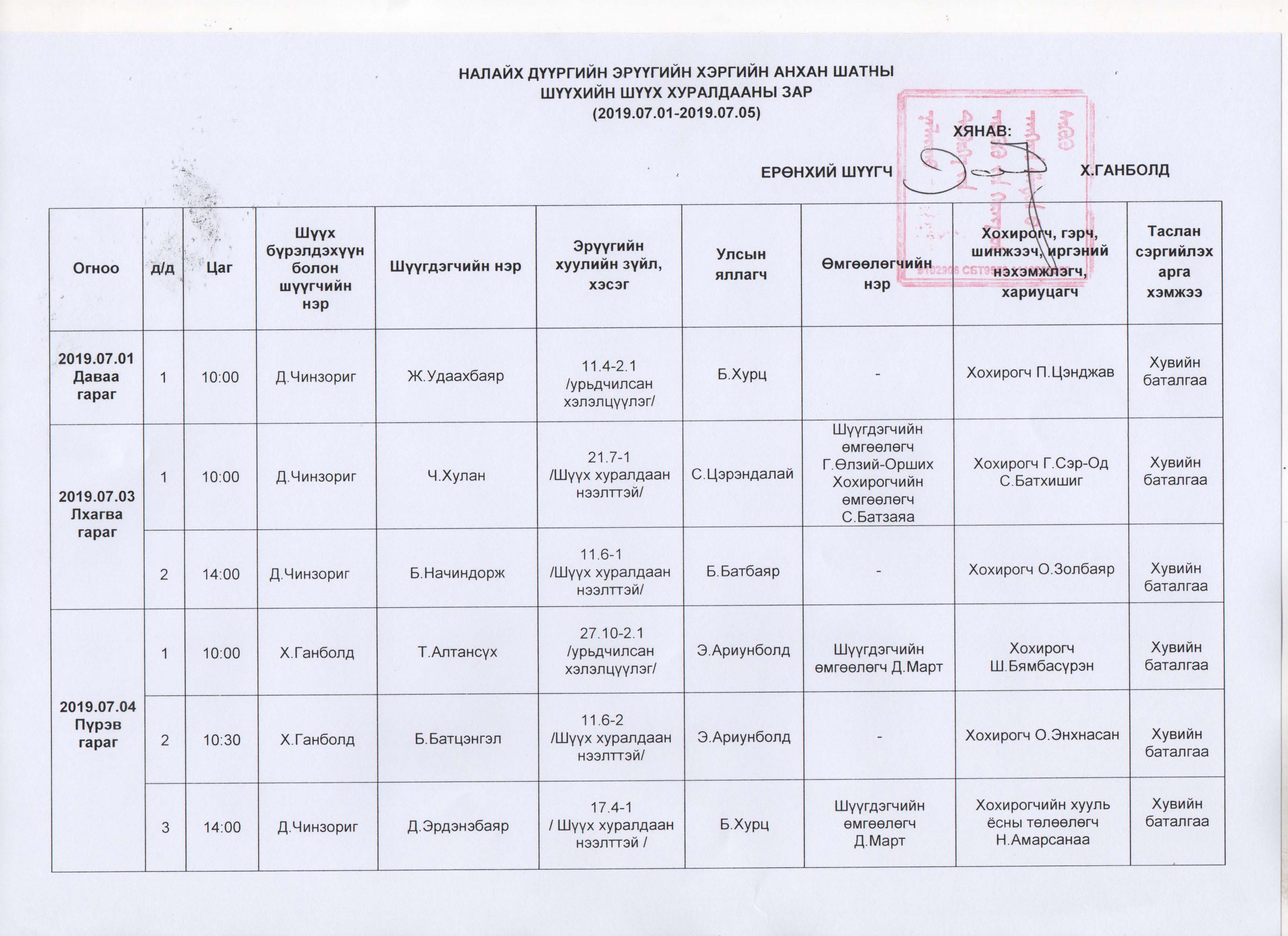 НАЛАЙХ - АНХАН ШАТНЫ ШҮҮХ ХУРАЛДААНААР ХЭЛЭЛЦҮҮЛЭХ ЭРҮҮГИЙН ХЭРГҮҮД (2019.07.01-07.05)