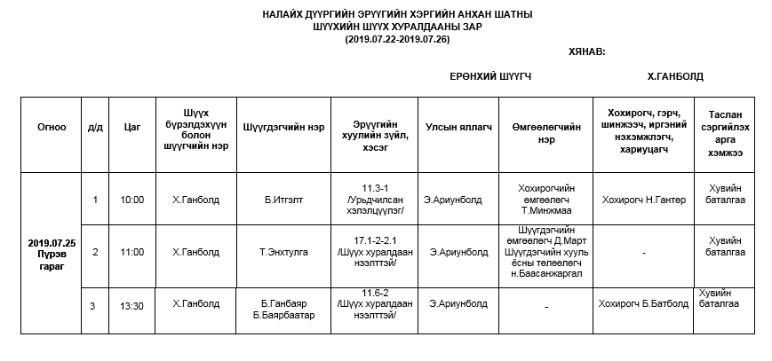 НАЛАЙХ - АНХАН ШАТНЫ ШҮҮХ ХУРАЛДААНААР ХЭЛЭЛЦҮҮЛЭХ ЭРҮҮГИЙН ХЭРГҮҮД (2019.07.22-07.26)