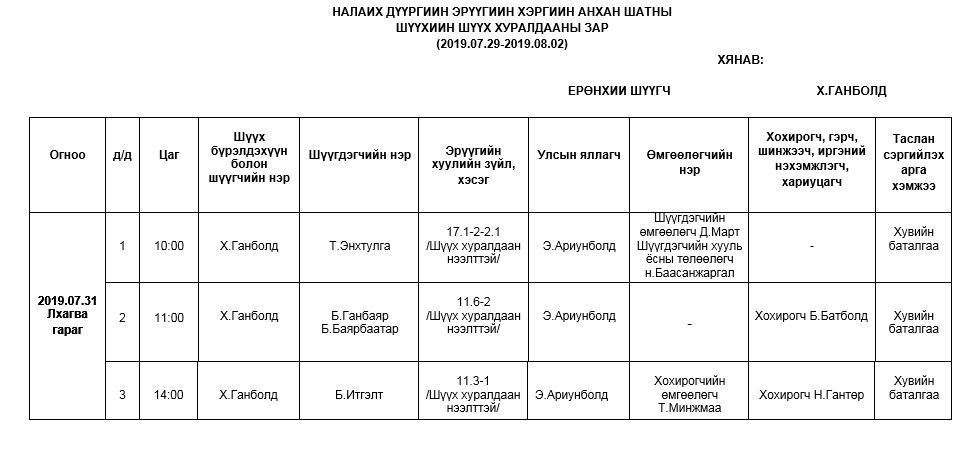 НАЛАЙХ - АНХАН ШАТНЫ ШҮҮХ ХУРАЛДААНААР ХЭЛЭЛЦҮҮЛЭХ ЭРҮҮГИЙН ХЭРГҮҮД (2019.07.29-08.02)