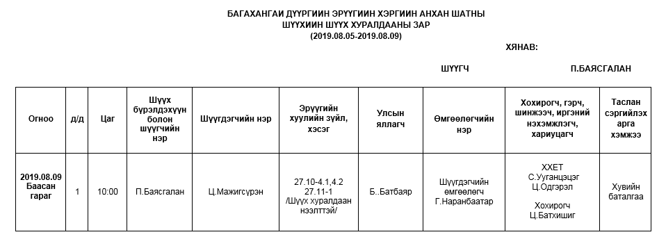 БАГАХАНГАЙ- АНХАН ШАТНЫ ШҮҮХ ХУРАЛДААНААР ХЭЛЭЛЦҮҮЛЭХ ЭРҮҮГИЙН ХЭРГҮҮД (2019.08.05-08.09)