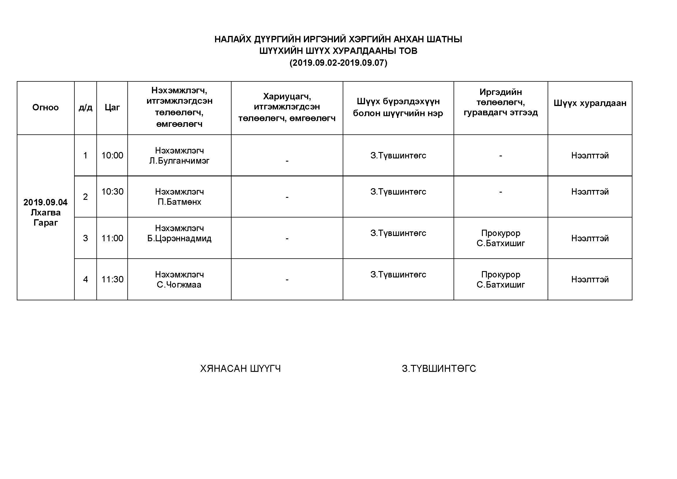 Налайх - Шүүх хуралдаанаар хэлэлцэх иргэний хэргүүд (2019.09.02-09.06)
