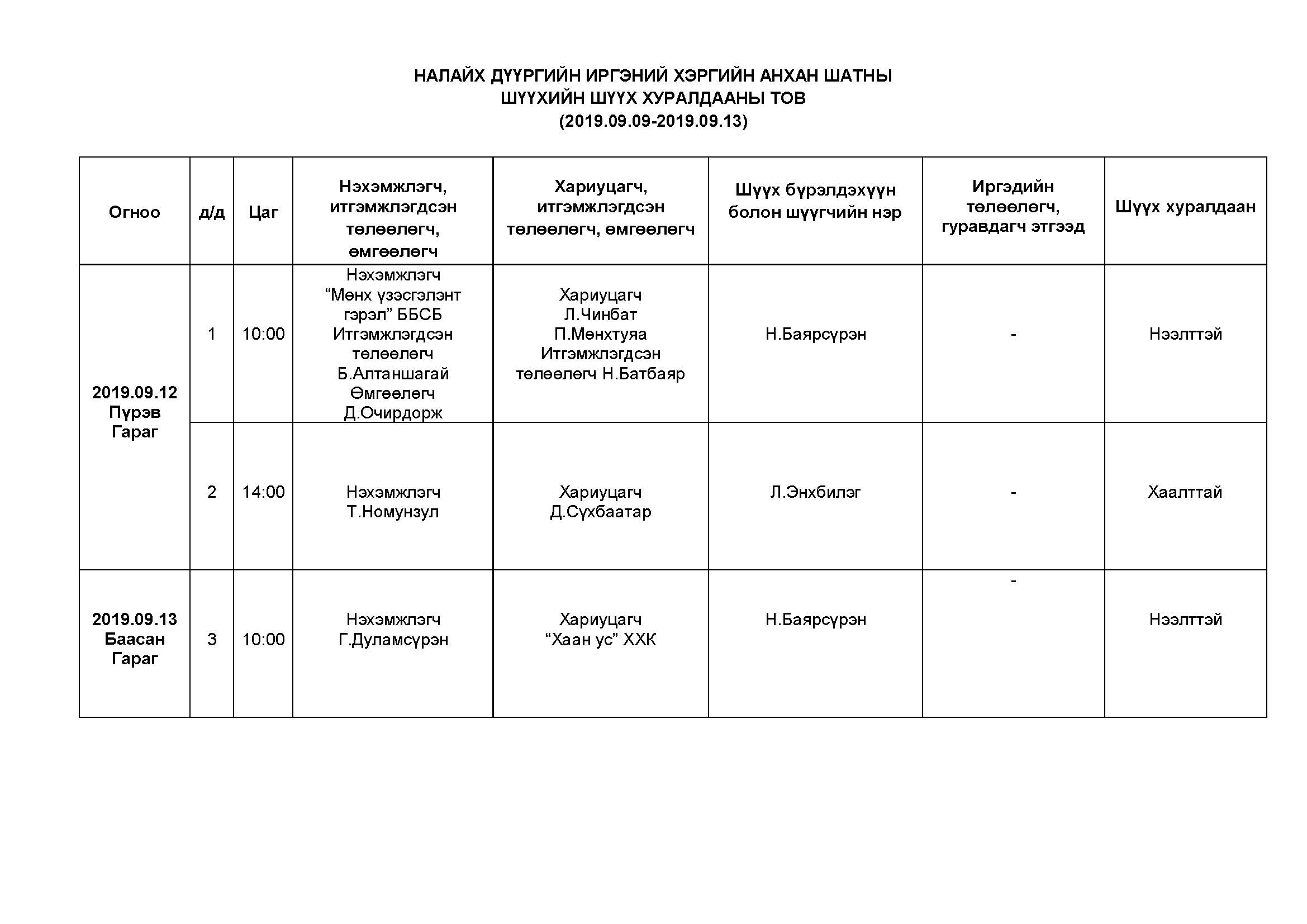 Налайх - Шүүх хуралдаанаар хэлэлцэх иргэний хэргүүд (2019.09.09-09.13)