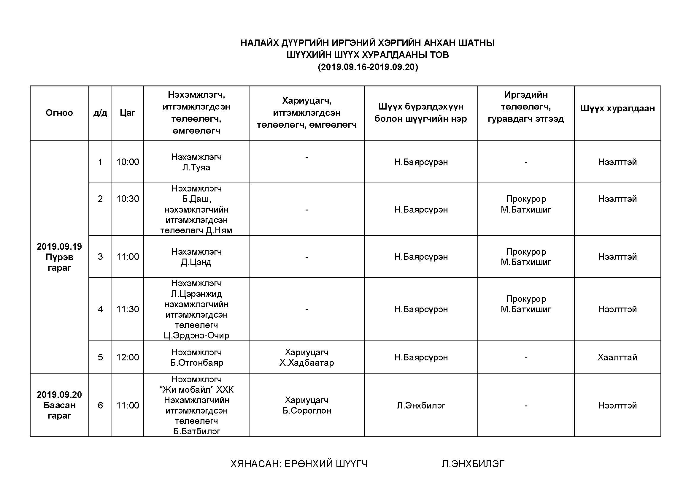 Налайх - Шүүх хуралдаанаар хэлэлцэх иргэний хэргүүд (2019.09.16-09.20)