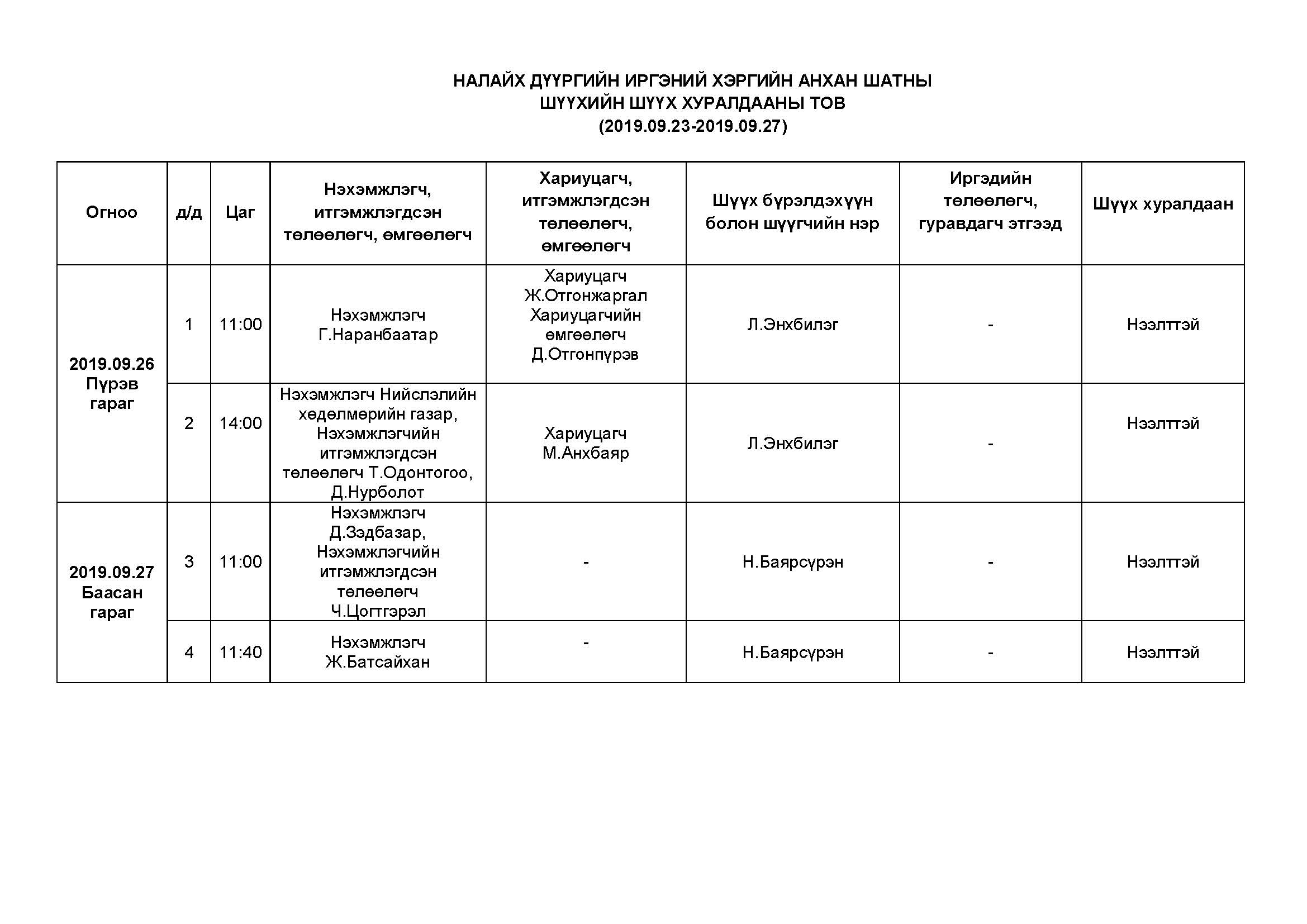 Налайх - Шүүх хуралдаанаар хэлэлцэх иргэний хэргүүд (2019.09.23-09.27)