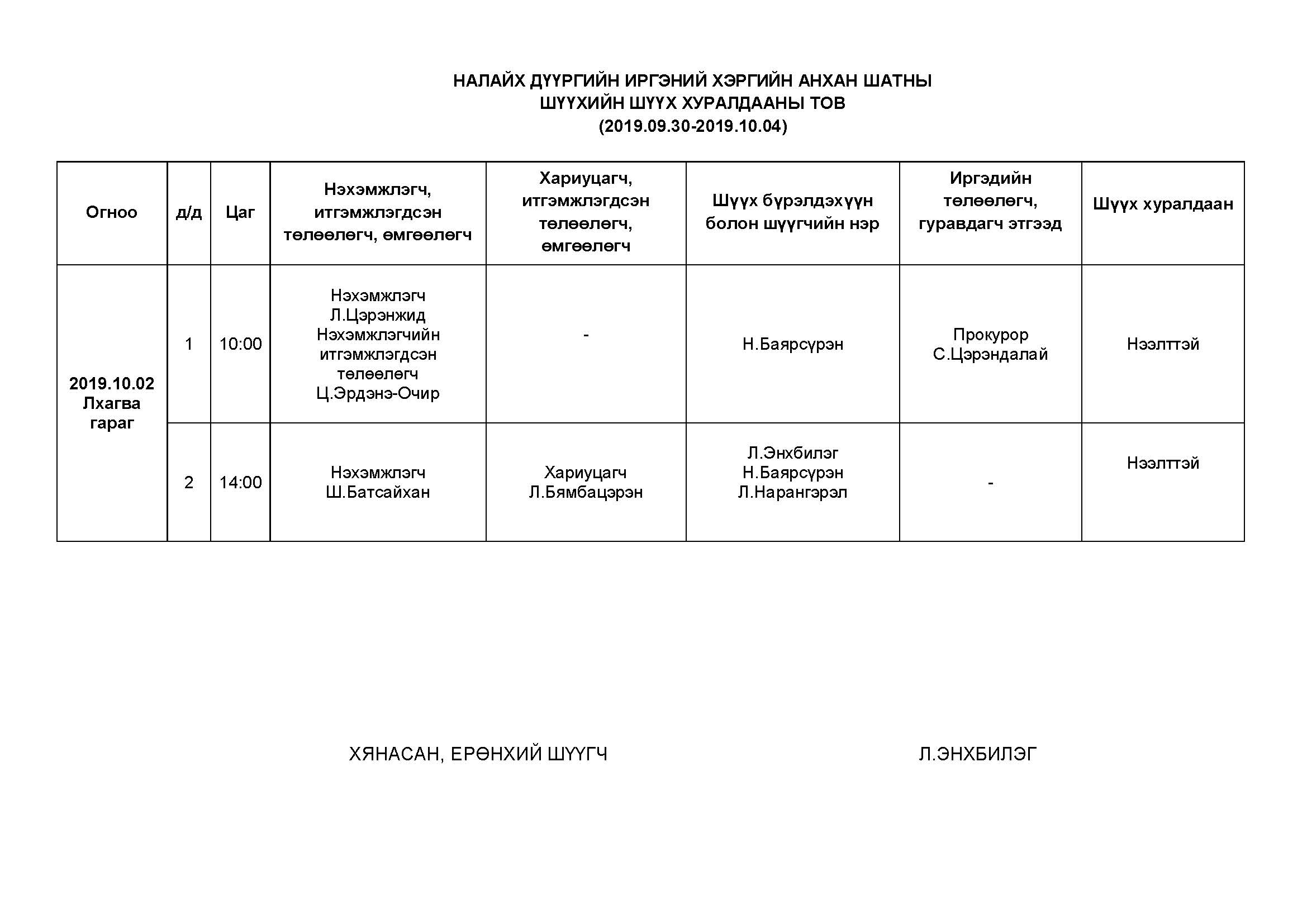 Налайх - Шүүх хуралдаанаар хэлэлцэх иргэний хэргүүд (2019.09.30-10.04)