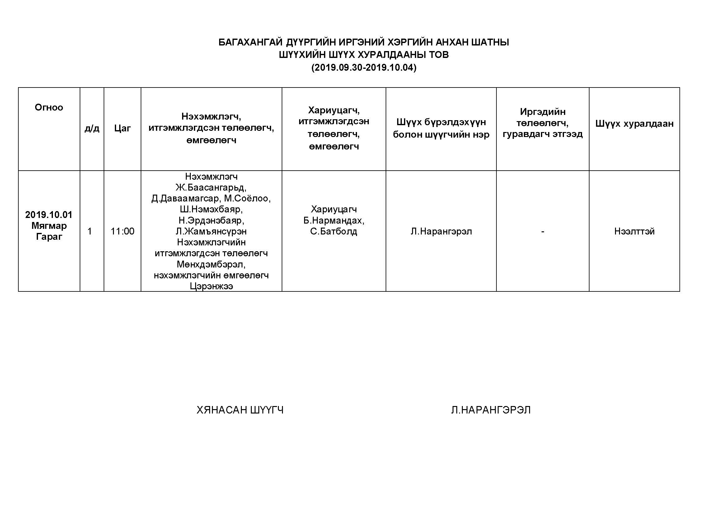 Багахангай - Шүүх хуралдаанаар хэлэлцэх иргэний хэргүүд (2019.09.30-10.04)