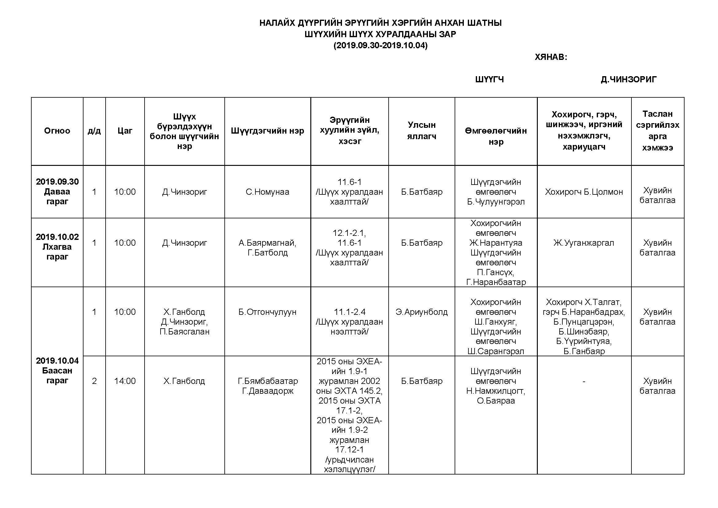 НАЛАЙХ - АНХАН ШАТНЫ ШҮҮХ ХУРАЛДААНААР ХЭЛЭЛЦҮҮЛЭХ ЭРҮҮГИЙН ХЭРГҮҮД (2019.09.30-10.04)