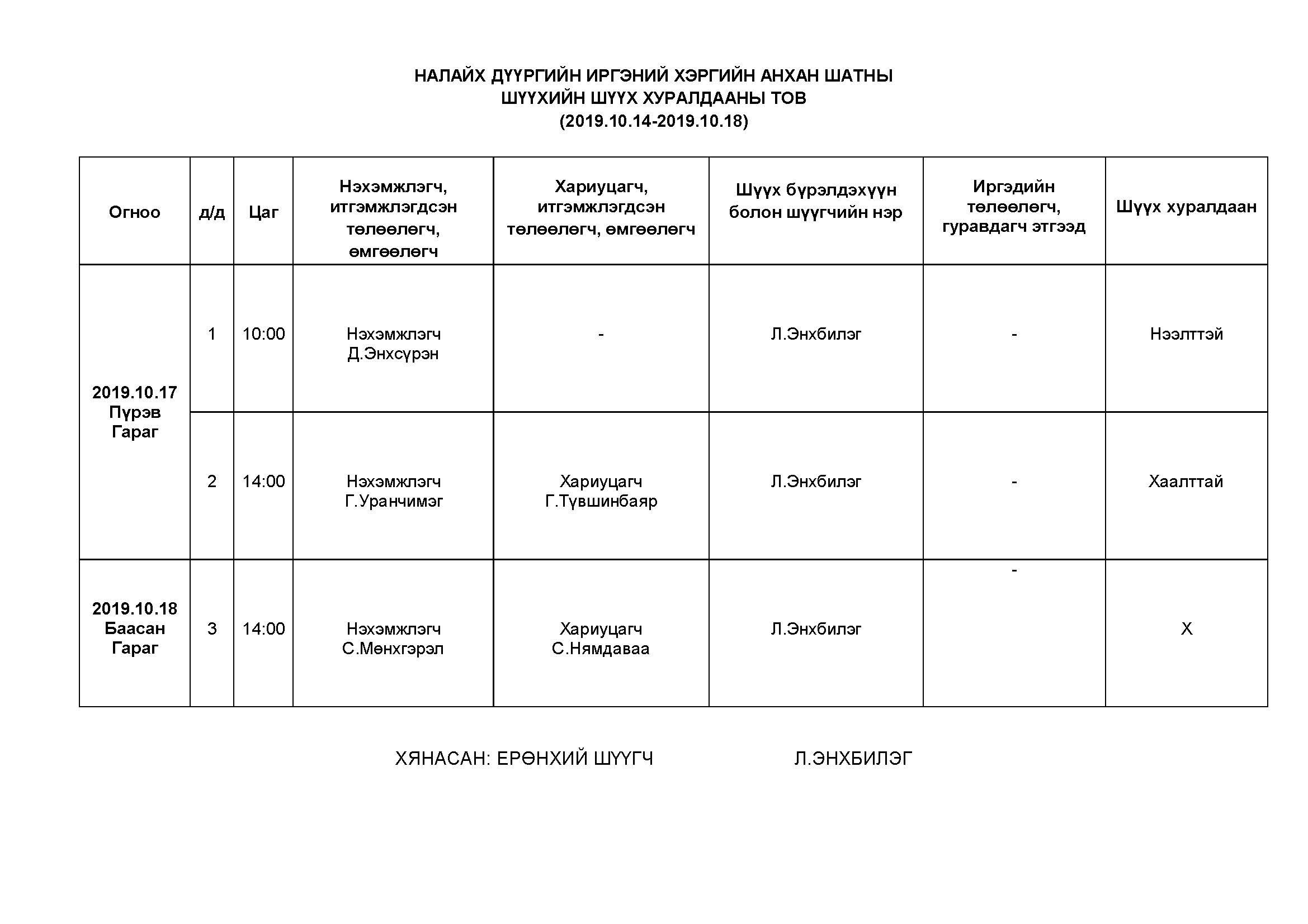Налайх - Шүүх хуралдаанаар хэлэлцэх иргэний хэргүүд (2019.10.14-10.18)