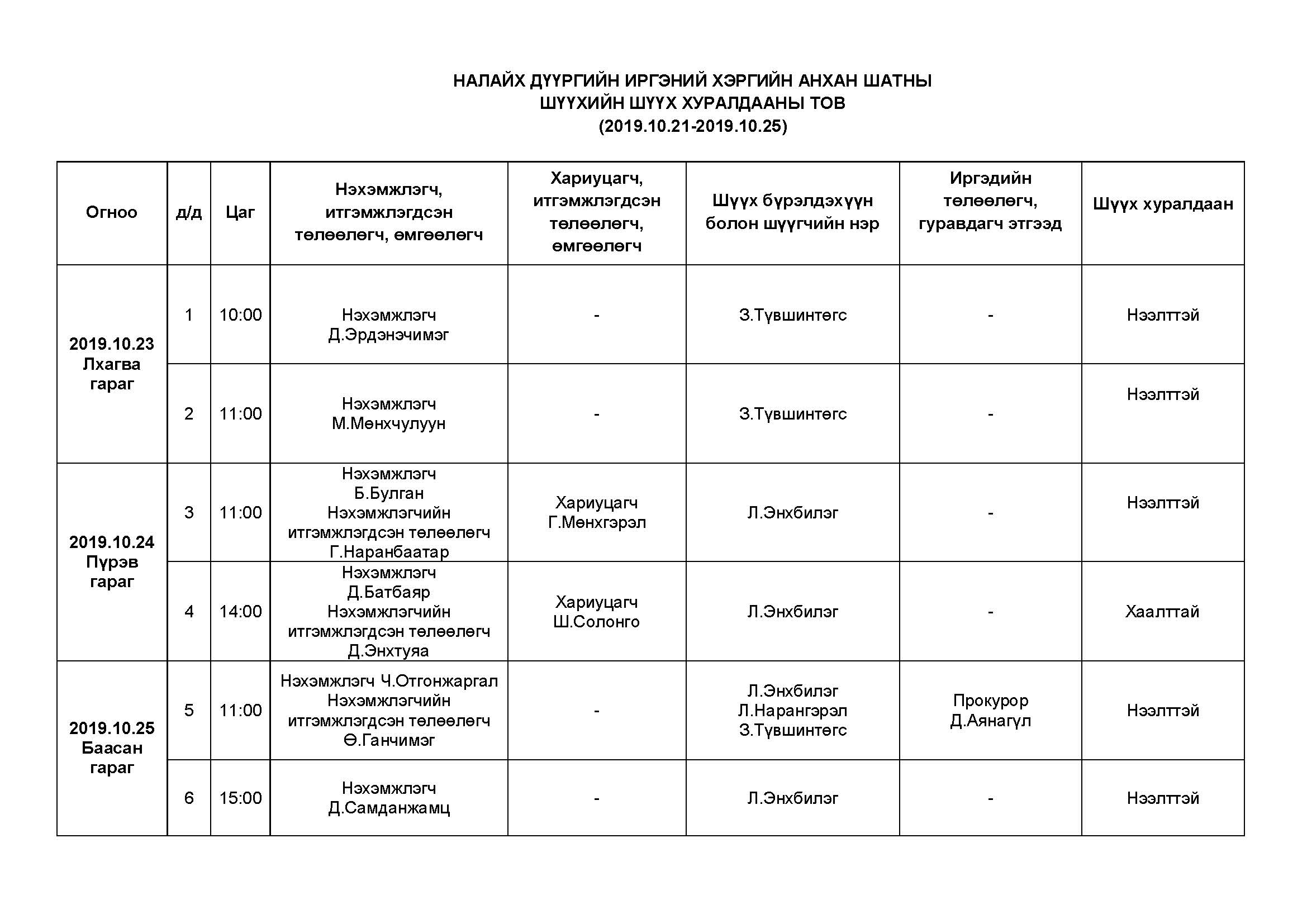 Налайх - Шүүх хуралдаанаар хэлэлцэх иргэний хэргүүд (2019.10.21-10.25)