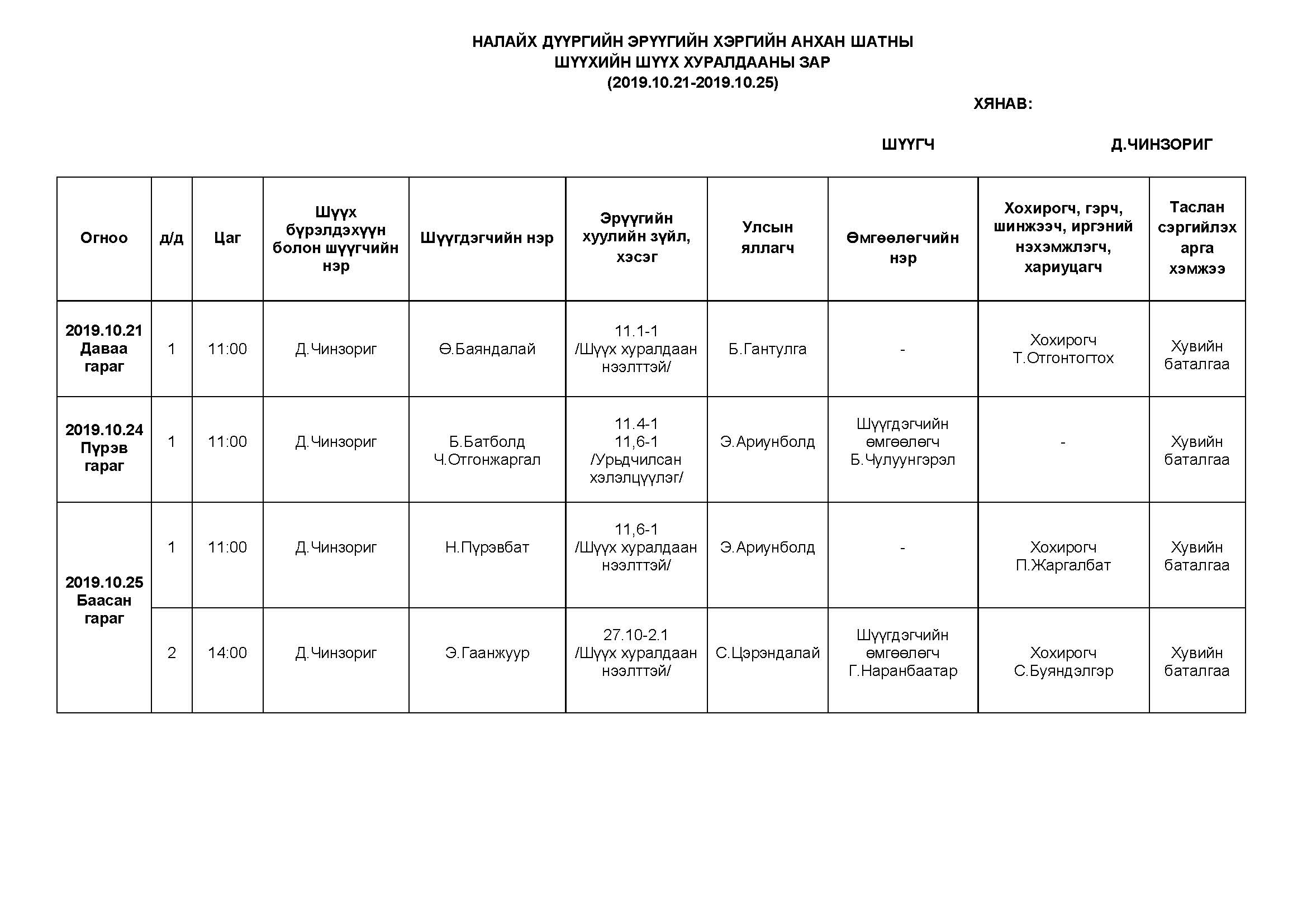НАЛАЙХ - АНХАН ШАТНЫ ШҮҮХ ХУРАЛДААНААР ХЭЛЭЛЦҮҮЛЭХ ЭРҮҮГИЙН ХЭРГҮҮД (2019.10.21-10.25)