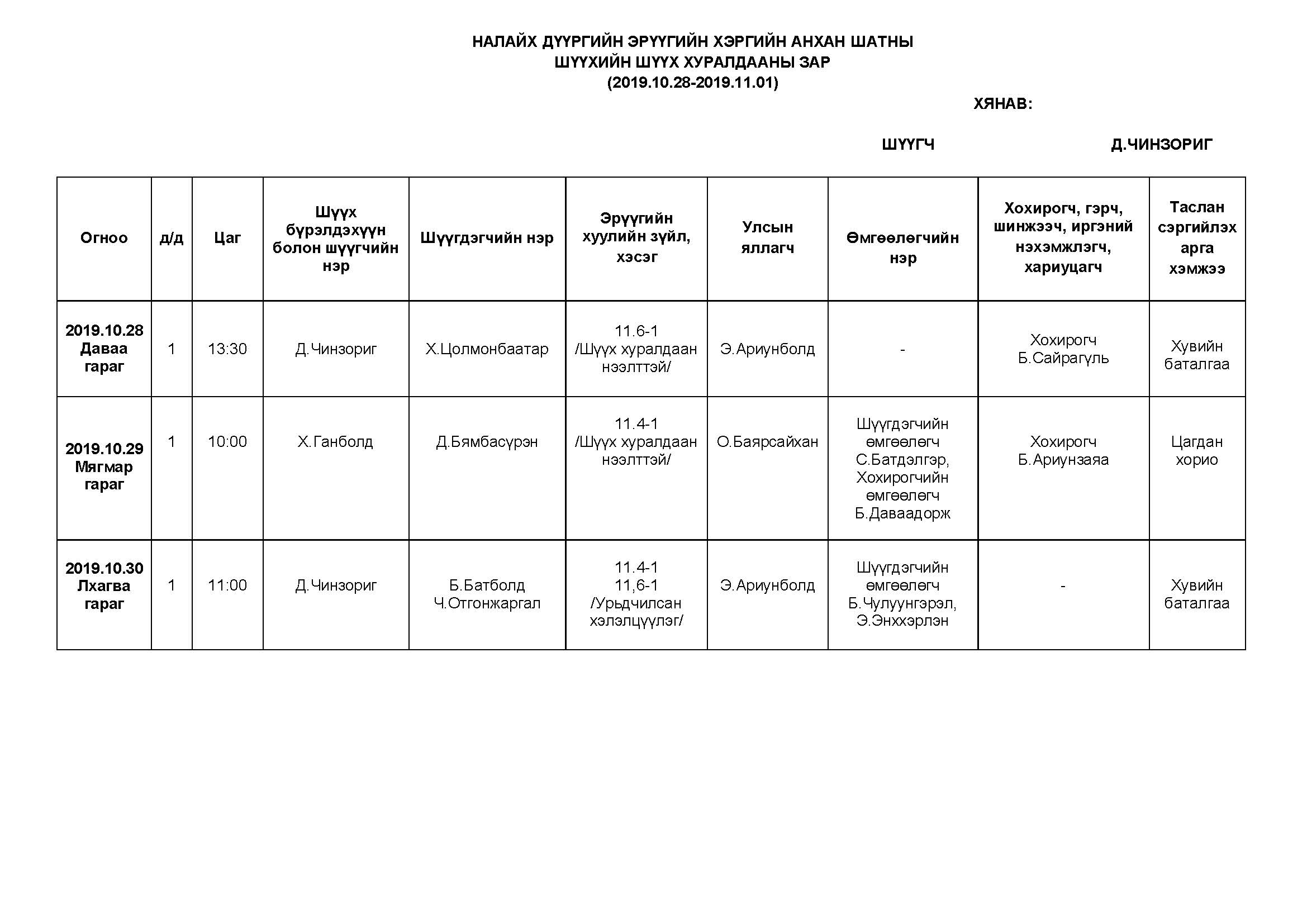 НАЛАЙХ - АНХАН ШАТНЫ ШҮҮХ ХУРАЛДААНААР ХЭЛЭЛЦҮҮЛЭХ ЭРҮҮГИЙН ХЭРГҮҮД (2019.10.28-11.01)