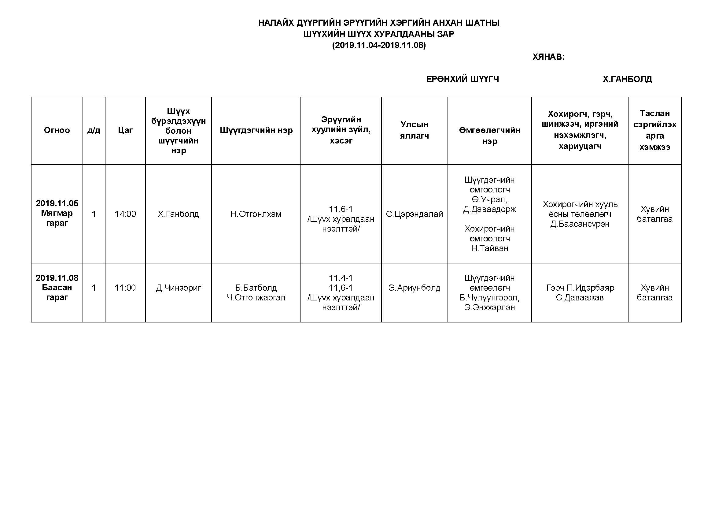 НАЛАЙХ - АНХАН ШАТНЫ ШҮҮХ ХУРАЛДААНААР ХЭЛЭЛЦҮҮЛЭХ ЭРҮҮГИЙН ХЭРГҮҮД (2019.11.04-11.08)