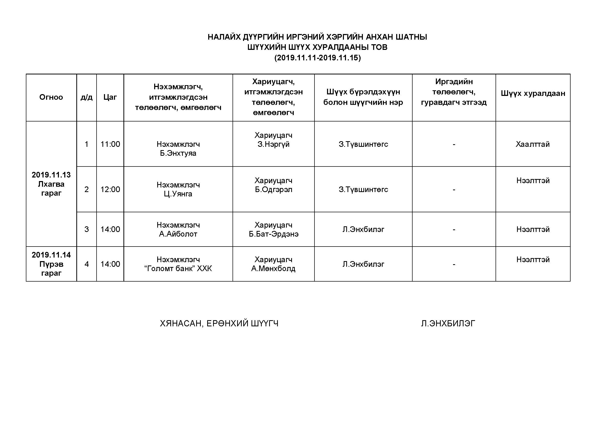 Налайх - Шүүх хуралдаанаар хэлэлцэх иргэний хэргүүд (2019.11.11-11.15)