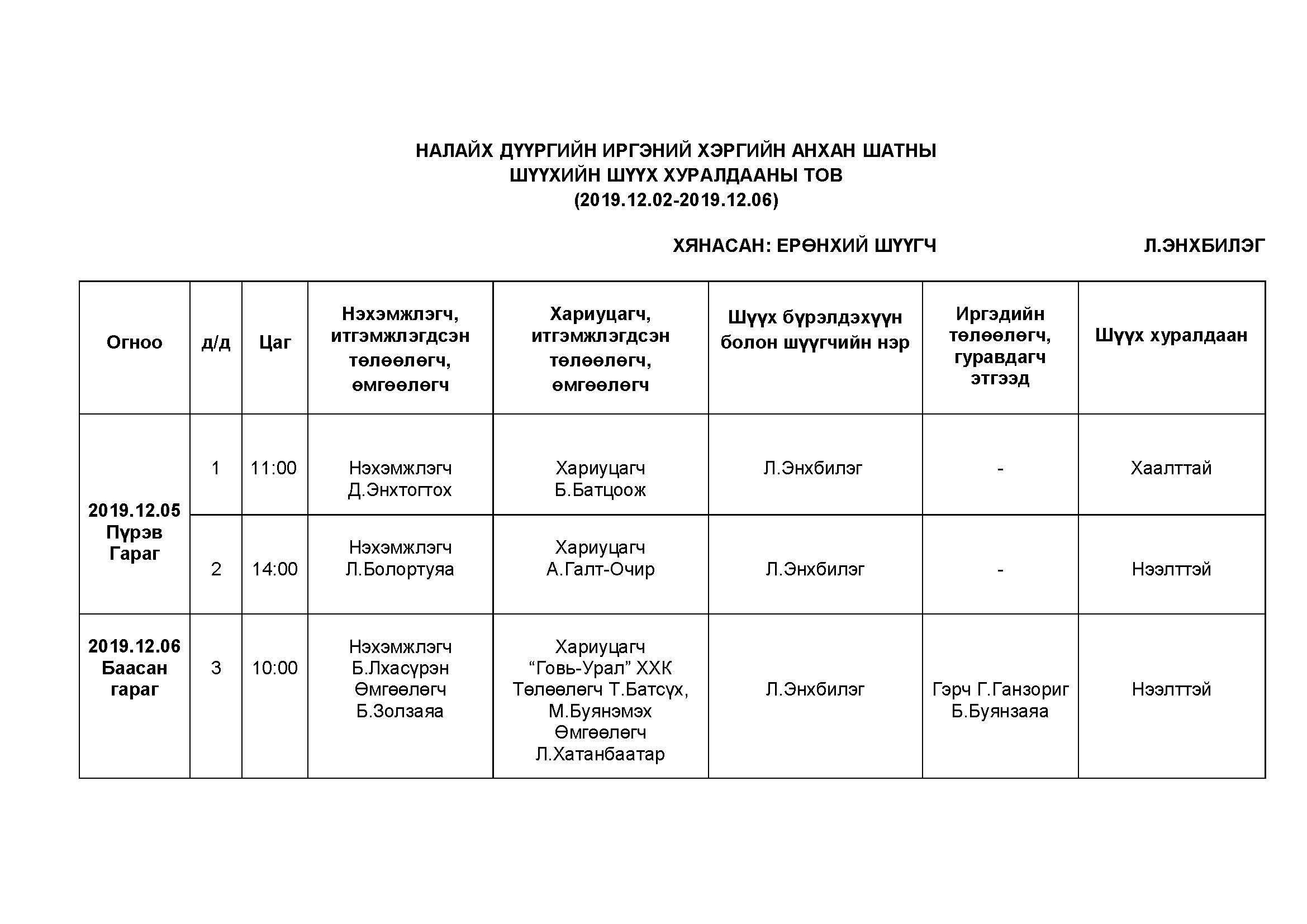 Налайх - Шүүх хуралдаанаар хэлэлцэх иргэний хэргүүд (2019.12.02-12.06)